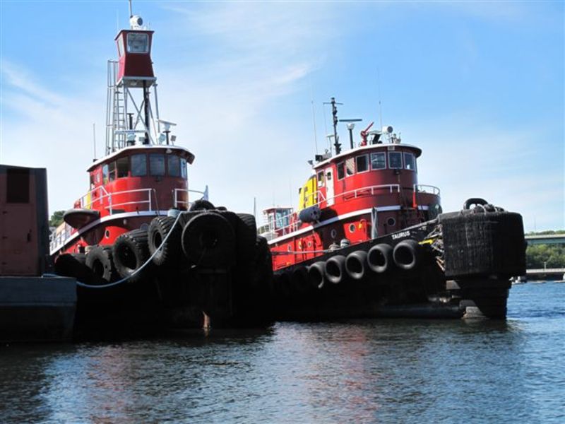 64k | Ex-Yuma (YTM-748) as Fournier tug Taurus, moored outboard of Fournier Boys at Belfast, ME, 12 September 2015. Photo by Steve Lang |