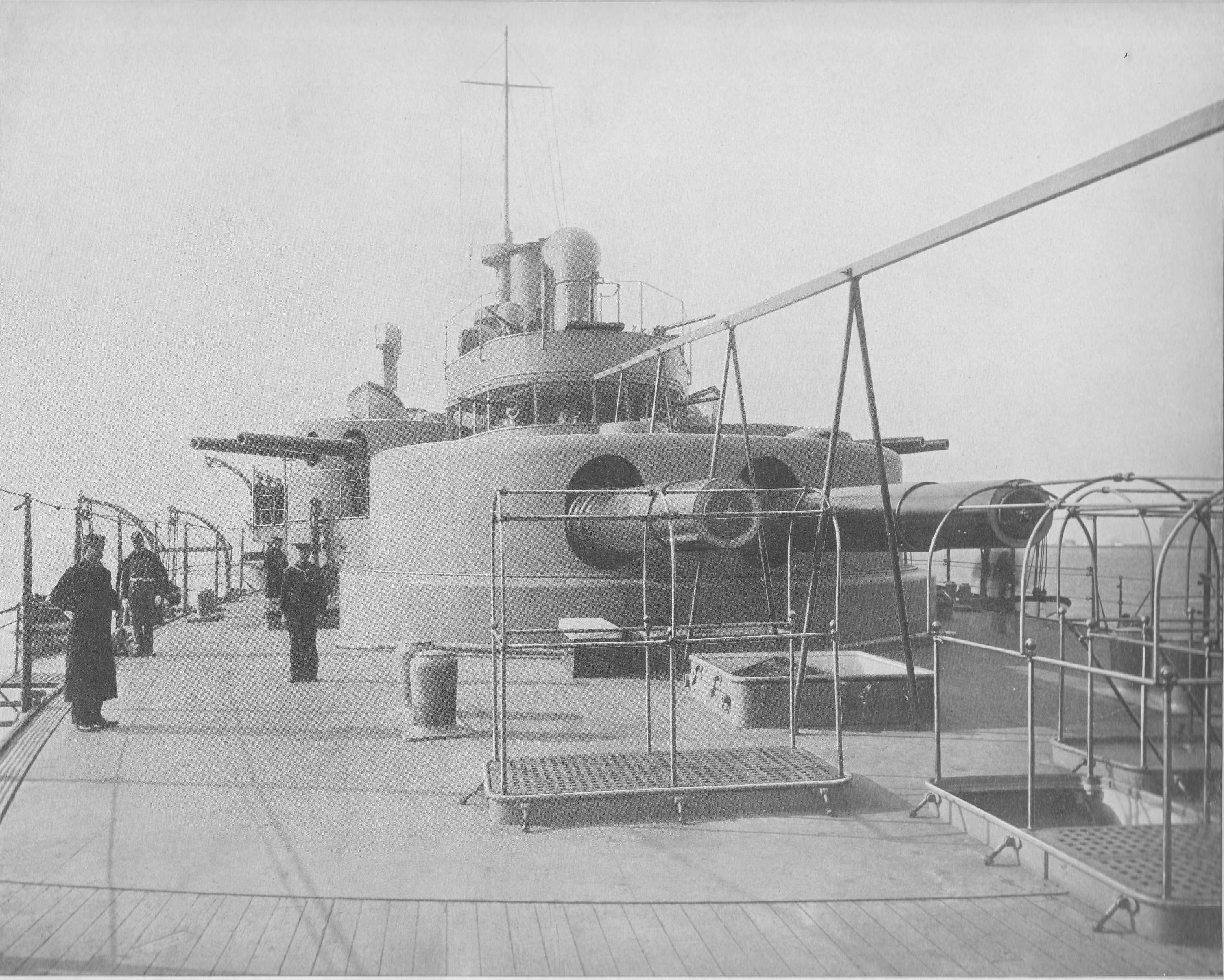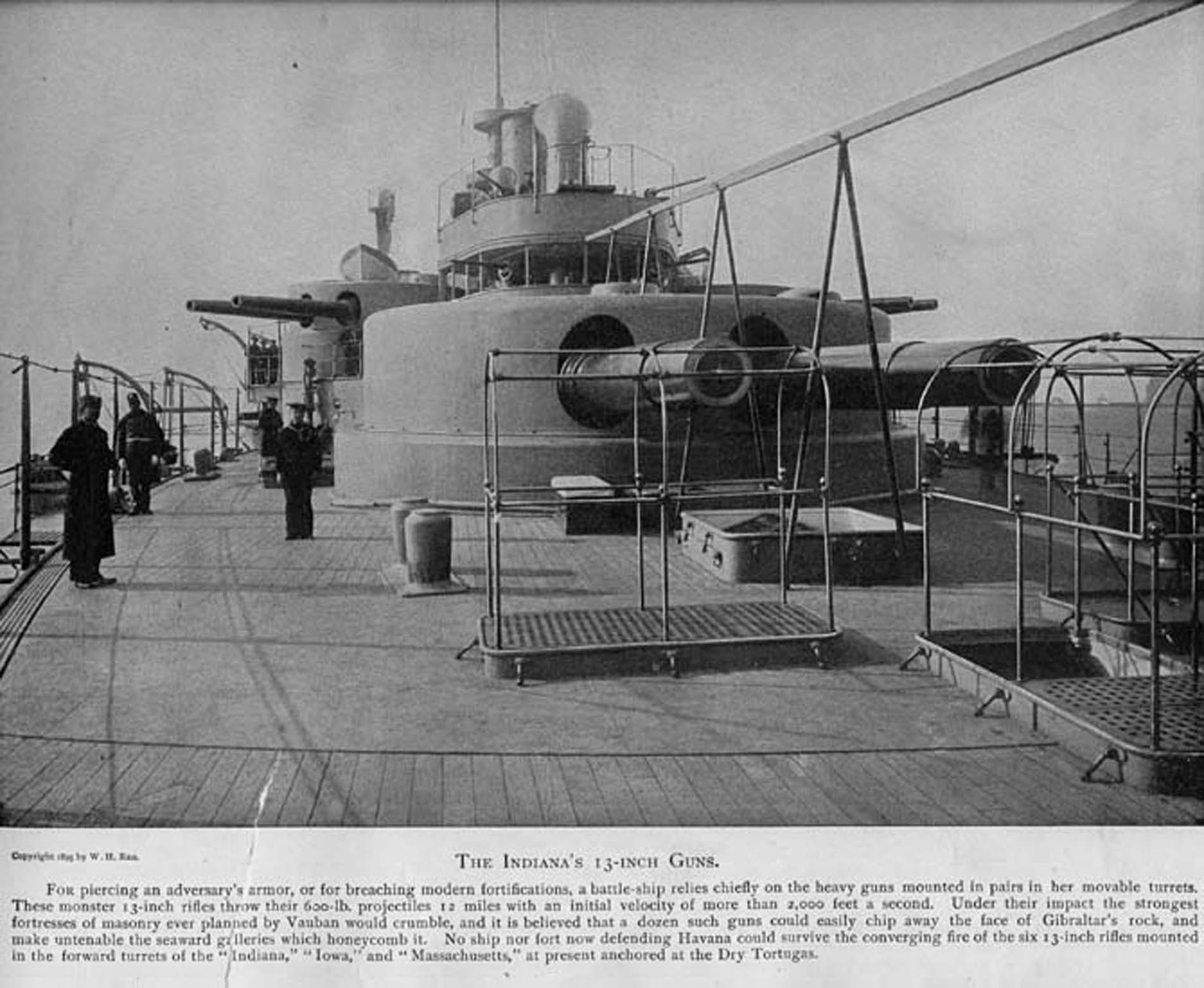 1.41k | Looking aft from the forecastle of battleship Indiana (BB-1), at the #1 Twin 13-Inch Turret. To the right a Secondary Battery, Twin 8-Inch turret. | Photo from The American Navy with Introduction and Descriptive Text - Reproductions of Photographs - Belford, Middlebrook & Co. - Chicago, 1898, submitted by Thomas Becher. | ||||||||||||||||||||||||||||||||||||||||||||||||||||||||||||||||||||||||||||||||||||||||||||||||||||||||||