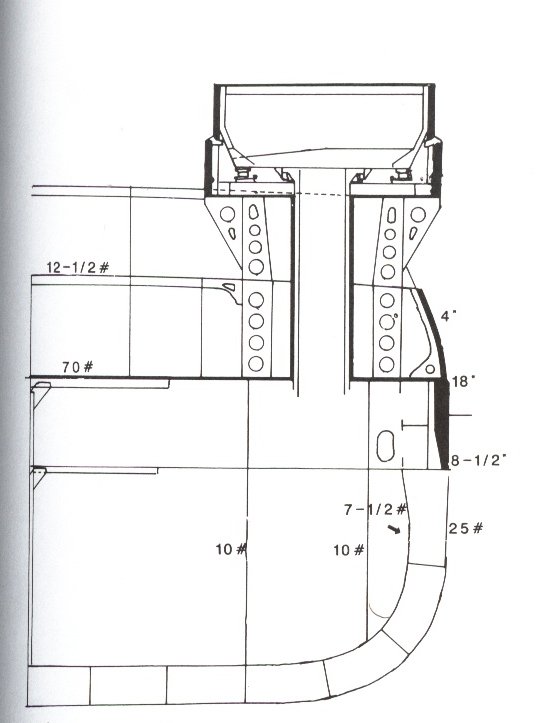 45k | Indiana (BB-1), cross section taken from a plan dated 1893. It shows in dashed outline the 8-inch turret as originally planned, with sloped sides. Virtually all U.S. warships of this period were designed with cone sided turrets, but in 1892 the Bureau of Ordnance had this policy reversed, arguing that such turrets were too cramped. | Photo and text courtesy of U.S. Battleships: An Illustrated Design History by Norman Friedman. | ||||||||||||||||||||||||||||||||||||||||||||||||||||||||||||||||||||||||||||||||||||||||||||||||||||||||||