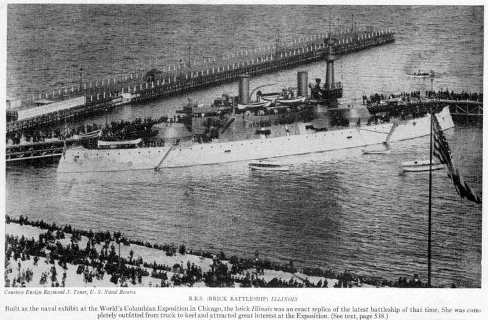 575k | Illinois exhibit at the 1893 World's Columbian Exposition in Chicago celebrating the 400th Anniversary of Christopher Columbus' voyage. The "ship" is not actually a ship but a mock-up made principally of wood sitting on a brick foundation built up from the bottom of Lake Michigan next to the dock. The design is based on design sketches of the Indiana class (BB-1 / 3) battleships, all 3 of which were launched in 1893. These ships represented the first class of modern battleships to be designed and built by the United States for the new Steel Navy. The Texas and the Maine were built in the US but were based on designs purchased from English ship yards. |