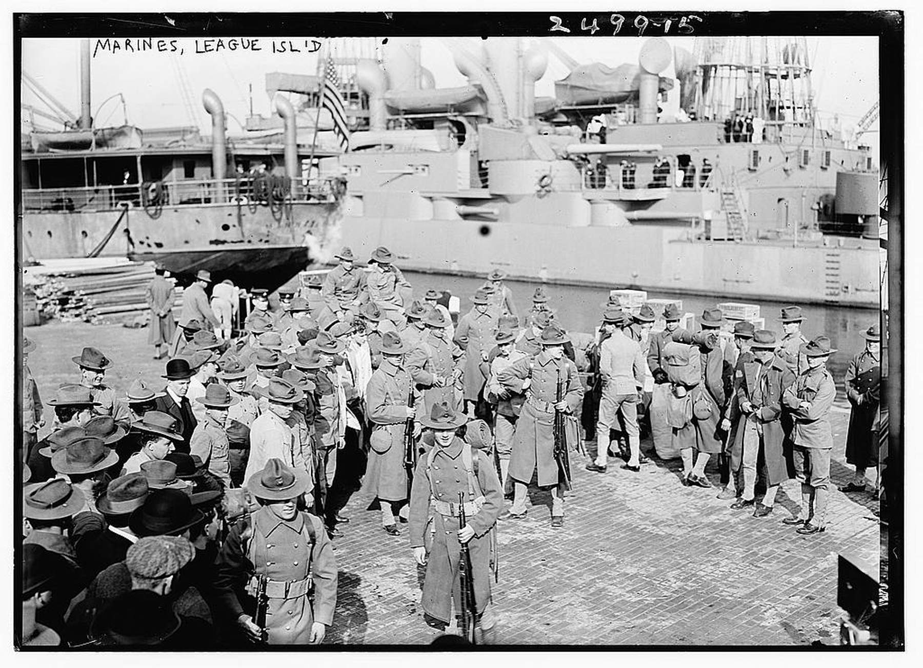 351k | Photo shows American Marines mobilizing at League Island, Philadelphia Naval Shipyard, PA, in February 1913, before going to Guantanamo, Cuba, in response to the Mexican Revolution. The ship to the left is the U.S. Army transport ship Meade. The ship in the background appears to be a Indiana class (BB-1 /03) battleship. DANFS indicates that either the Indiana (BB-1) or Massachusetts (BB-2) were both on the East coast at this period of time before being decommissioned in Philadelphia the following year. |