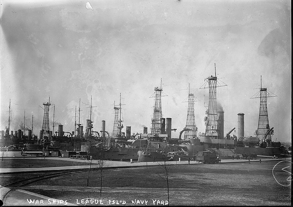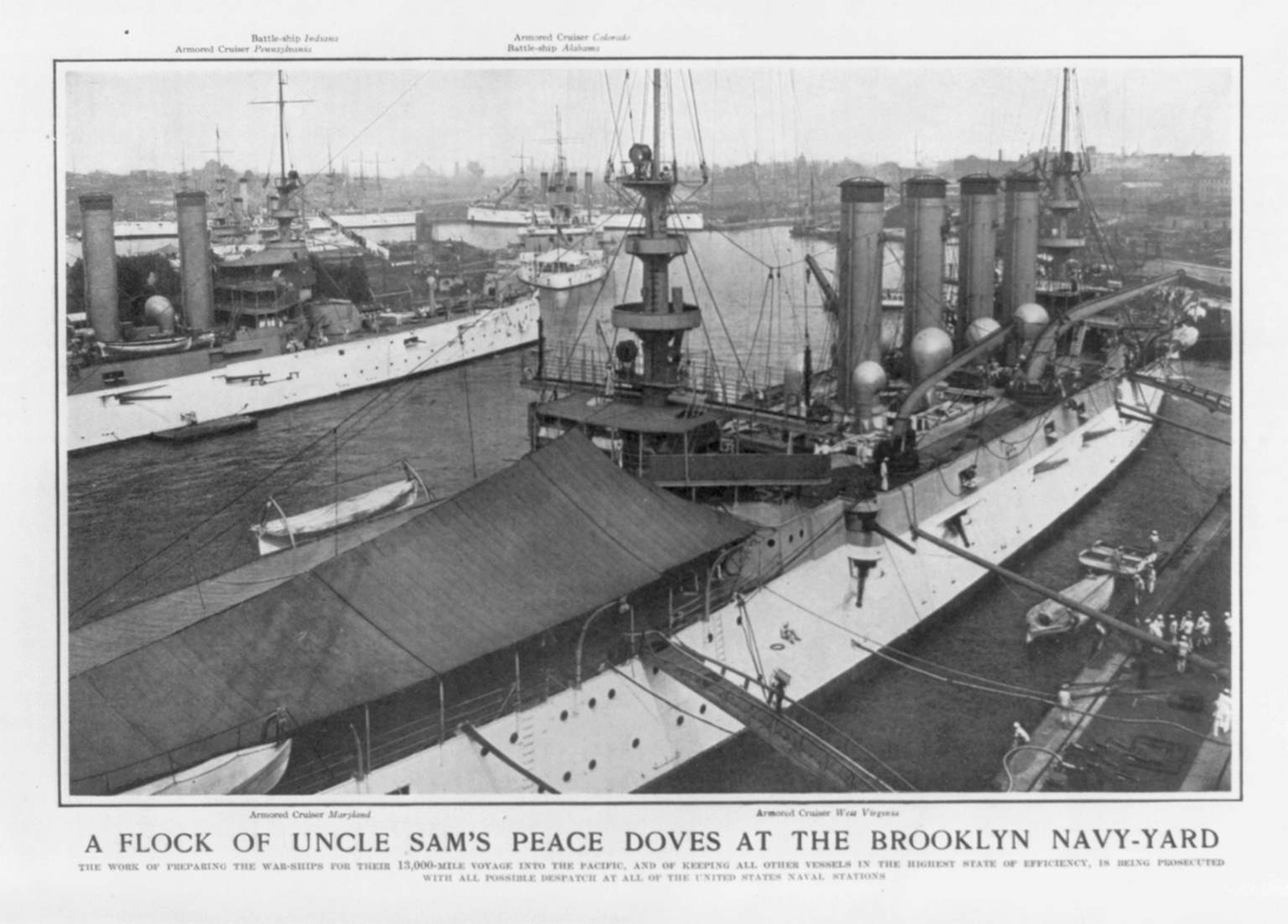 NR | ARGENTINE SAILORS DRILLING AT NAVY YARD ON THE NOSE ENDS OF FIVE OF UNCLE SAM'S NAVAL BULLDOGS An unusual photograph, taken at League Island, showing five battleships and steamer lying in a row while the seamen of the South American Republic make themselves as much at home as if on their own drill grounds, by special arrangement with the U.S. government. Either the Indiana (BB-1) or the Massachusetts (BB-2) is the first battleship on the left side. The distinctive twin funnels of the Illinois (BB-7) or Alabama (BB-8) appear two ships down. | Image and text provided by Penn State University Libraries; University Park, PA. Photo from Evening Public Ledger. (Philadelphia [Pa.]) 1914-1942, 05 March 1915, Night Extra, Image 16, via chroniclingamerica.loc.gov. | ||||||||||||||||||||||||||||||||||||||||||||||||||||||||||||||||||||||||||||||||||||||||||||||||||||||||||