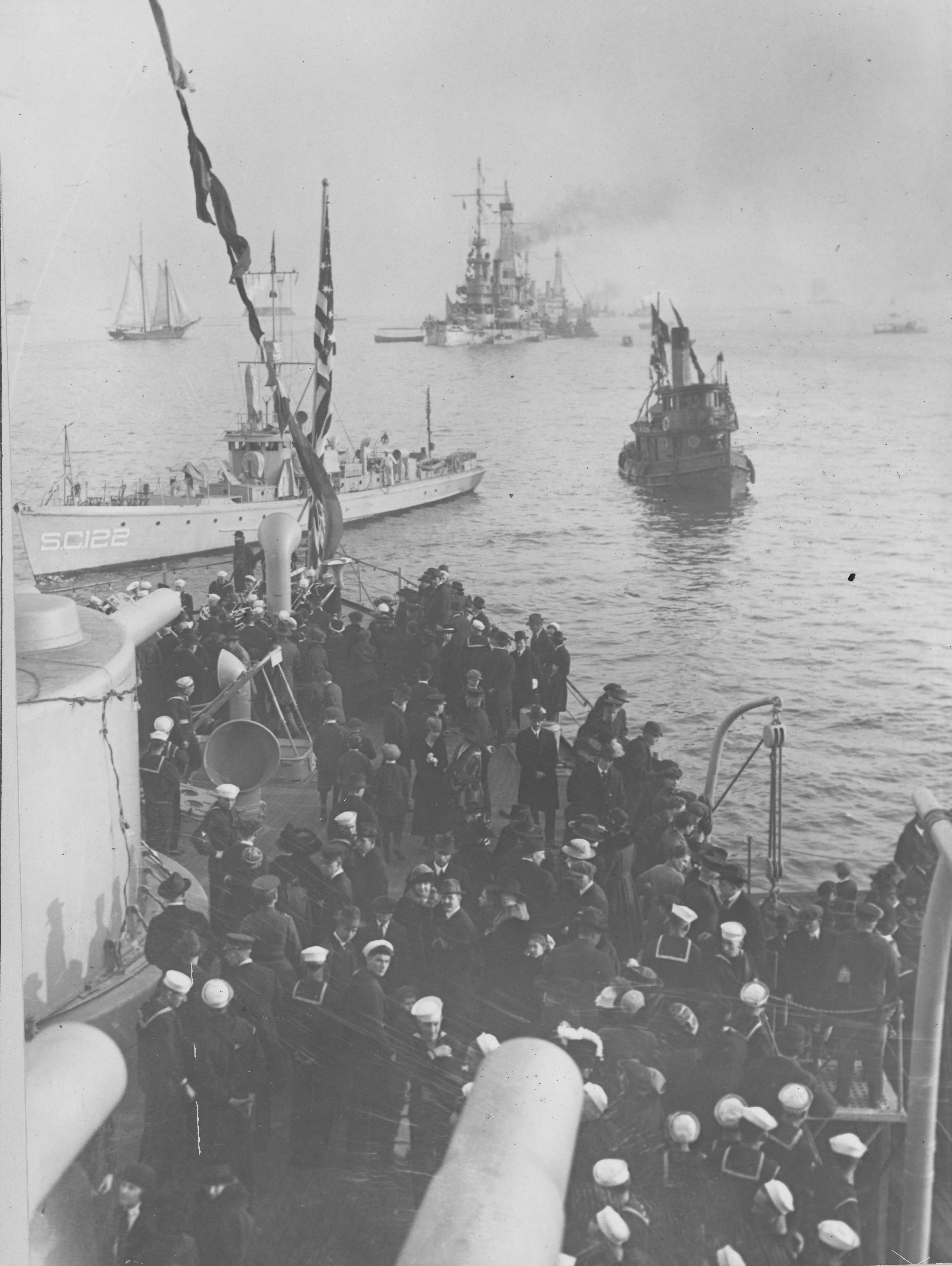 1.17k | First review of warships since America entered the war forms part of Commercial Congress Convention. Fleet in bay, from stern of flagship commanded by Rear Admiral H.A. Wiley. The subchaser SC 122 appears on the left & 2 battleships of the Indiana class bring up the rear, 26 December 1918. |