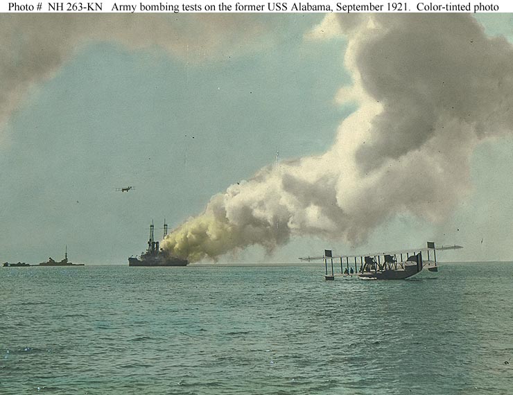 ![]() 83k | Ex-Alabama (BB-8) showing the effect of a phosphorus bomb, while serving as a target for U.S. Army bombers in Chesapeake Bay, 27 September 1921. An Army Martin twin-engine bomber is flying overhead. Also visible, in the foreground, is a Navy F5L seaplane. Wrecks in the distance are the old battleships San Marcos (furthest to the left) and Indiana (BB-1).