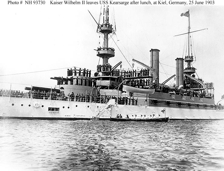 120k | Crew manning the rails and superstructure, with arms linked, as German Kaiser Wilhelm II leaves the ship following lunch on board, at Kiel, Germany, 25 June 1903. The Kaiser is seated in the stern of the rowing cutter, in the center of the photograph. | Photo # NH 93730, from the collections of the U.S. Naval Historical Center, collection of Paymaster William R. Pattison, USN. | ||||||||||||||||||||||||||||||||||||||||||||||||||||||||||||||||||||||||||||||||||||||||||||||||||||||||||||||||||||||||||||||||||||||||||||||||||||||||||||||||||||||||||||||||||||||||||||||||||||||||||||||||||||||||||||||||||||||||||||||||||||||||||||||||