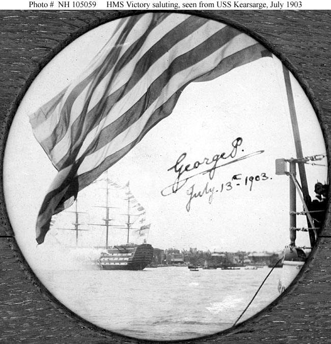 69k | HMS Victory firing a salute in honor of the visit by ships of the U.S. European Squadron to Portsmouth, England, 13 July 1903. Photographed from just beyond the stern of the visiting squadron's flagship, Kearsarge (BB-5), whose National Ensign is in the upper foreground. The print has been signed by Prince George (later King George V). This photograph is mounted in a frame made of wood from HMS Victory. | Photo # NH 105059, from the collections of the U.S. Naval Historical Center, courtesy of the Naval Historical Foundation. Donation of O.J. Hemphill. | ||||||||||||||||||||||||||||||||||||||||||||||||||||||||||||||||||||||||||||||||||||||||||||||||||||||||||||||||||||||||||||||||||||||||||||||||||||||||||||||||||||||||||||||||||||||||||||||||||||||||||||||||||||||||||||||||||||||||||||||||||||||||||||||||