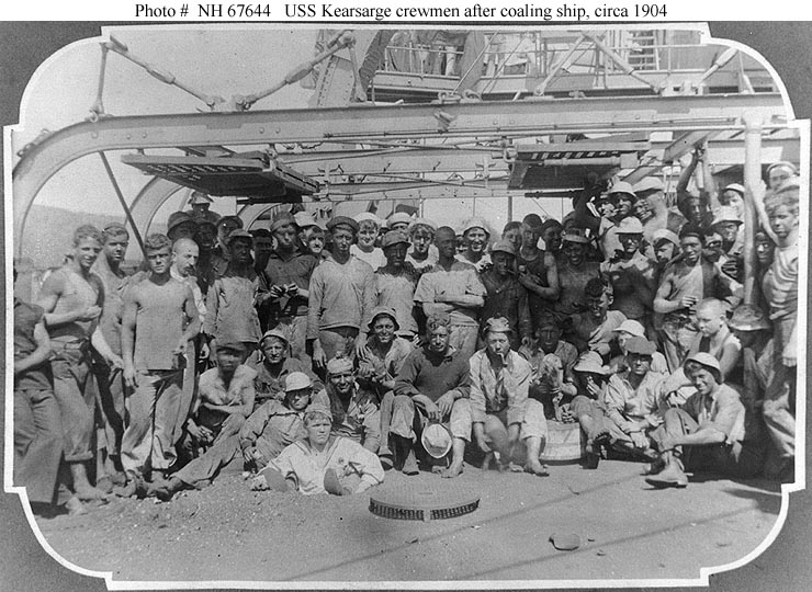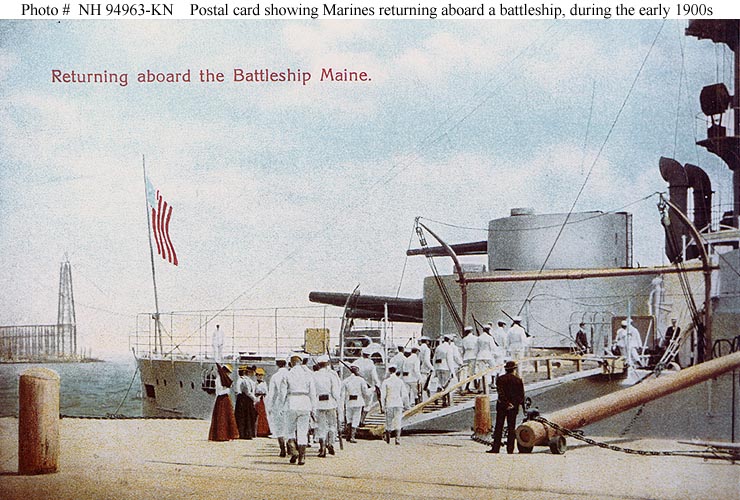 113k | Returning on board a U.S. Navy battleship, circa the early 1900s. The photograph was printed at about that time, in color-tinted form, on a postal card published by the Hugh C. Leighton Company, Portland, Maine. The original postal card's caption erroneously identifies the ship as Maine (BB-10). She is actually Kearsarge (BB-5) or her sister ship, Kentucky (BB-6). | Photo # NH 94963-KN, from the collections of the U.S. Naval Historical Center. | ||||||||||||||||||||||||||||||||||||||||||||||||||||||||||||||||||||||||||||||||||||||||||||||||||||||||||||||||||||||||||||||||||||||||||||||||||||||||||||||||||||||||||||||||||||||||||||||||||||||||||||||||||||||||||||||||||||||||||||||||||||||||||||||||