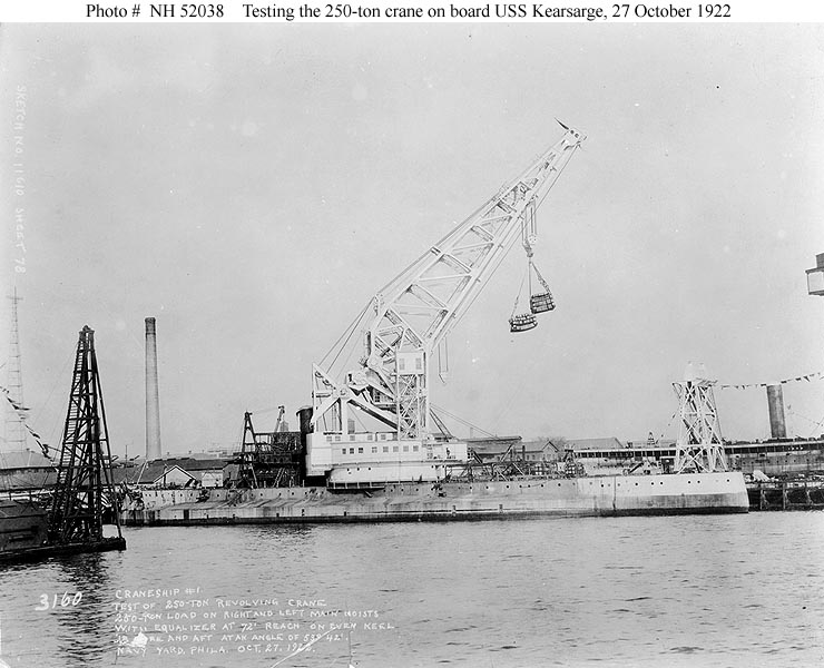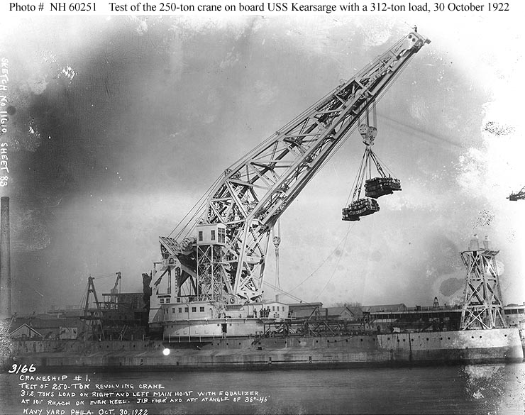 84k | U.S. Crane Ship No. 1 test of the ship's 250-ton revolving crane, at the Philadelphia Navy Yard, Pennsylvania, 27 October 1922. Kearsarge, which was still undergoing conversion at the time (note the incomplete superstructure ahead of the crane) is seen here lifting a 250-ton load on the right and left main hoists with equalizer at 72-foot reach on an even keel. Jib fore and aft at an angle of 53 degrees 42 minutes. | Official USN photo # NH 52038, from the collections of the Naval Historical Center. | ||||||||||||||||||||||||||||||||||||||||||||||||||||||||||||||||||||||||||||||||||||||||||||||||||||||||||||||||||||||||||||||||||||||||||||||||||||||||||||||||||||||||||||||||||||||||||||||||||||||||||||||||||||||||||||||||||||||||||||||||||||||||||||||||