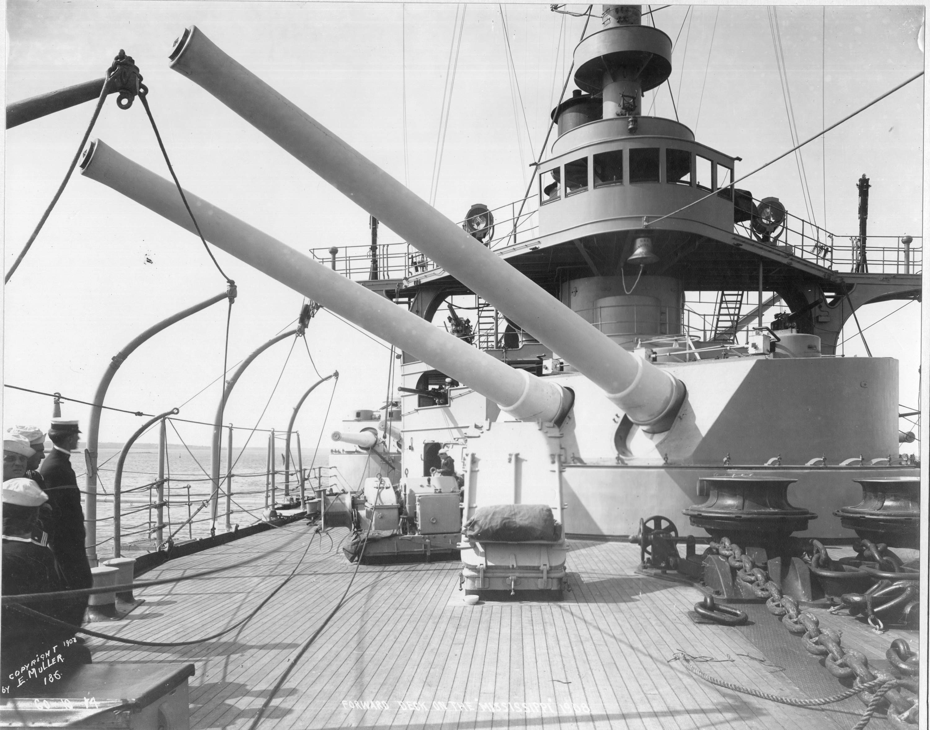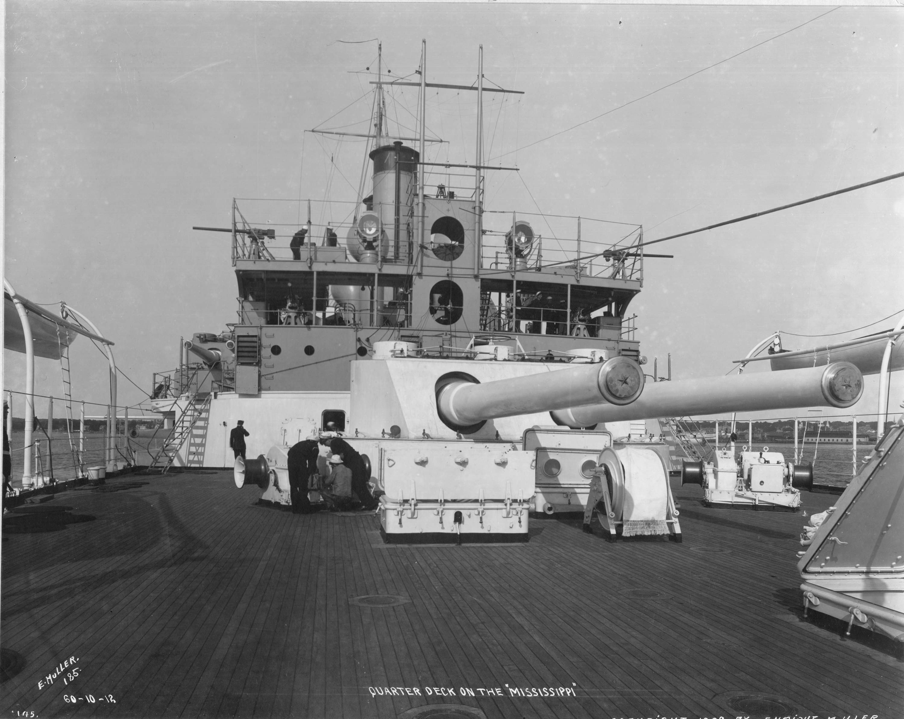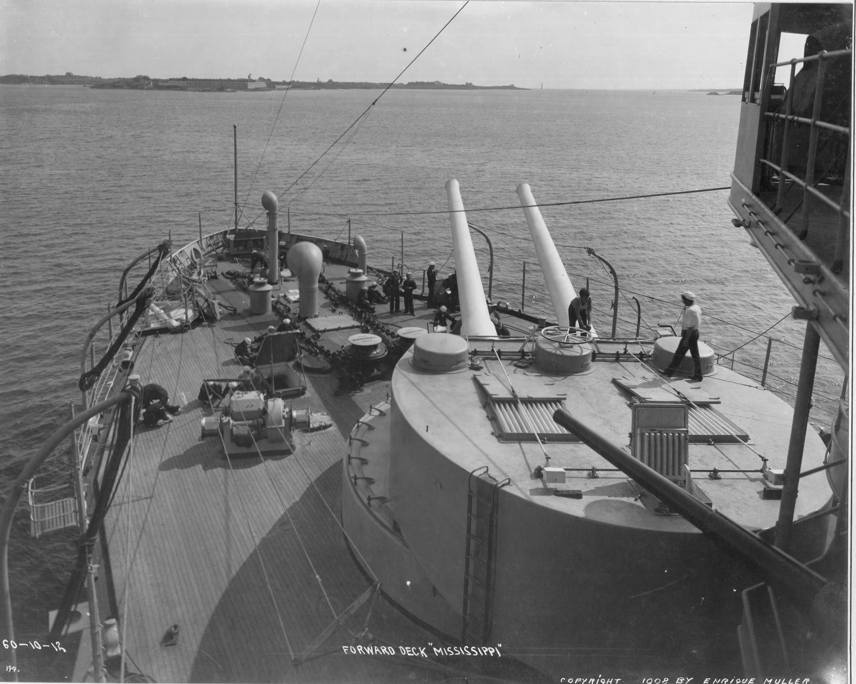 Forward deck of the Mississippi (BB-23), turret pointed to starboard. | Photo by Enrique Muller Jr. | USN photo # 19-N-60-01-10 & 19-N-60-10-10, from NARA, College Park, Maryland, courtesy of Sean Hert. ![]() 514k |