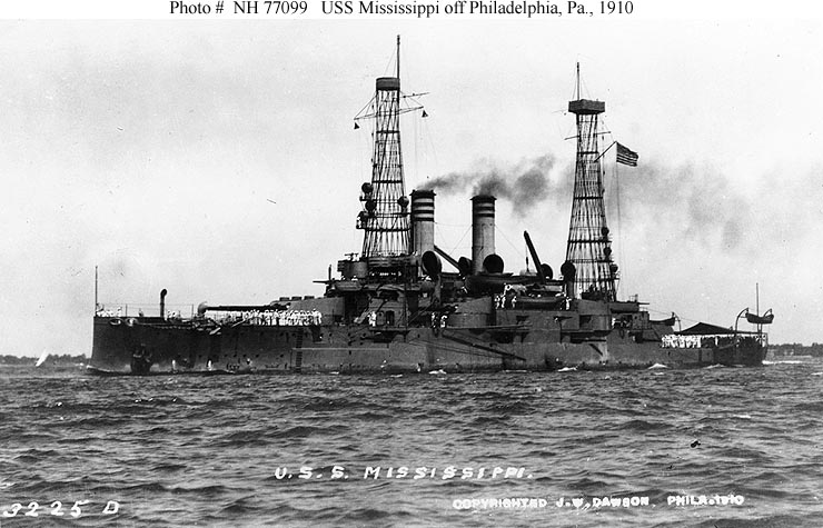 Mississippi (BB-23) circa 1910, shortly after she was fitted with a cage mast. |