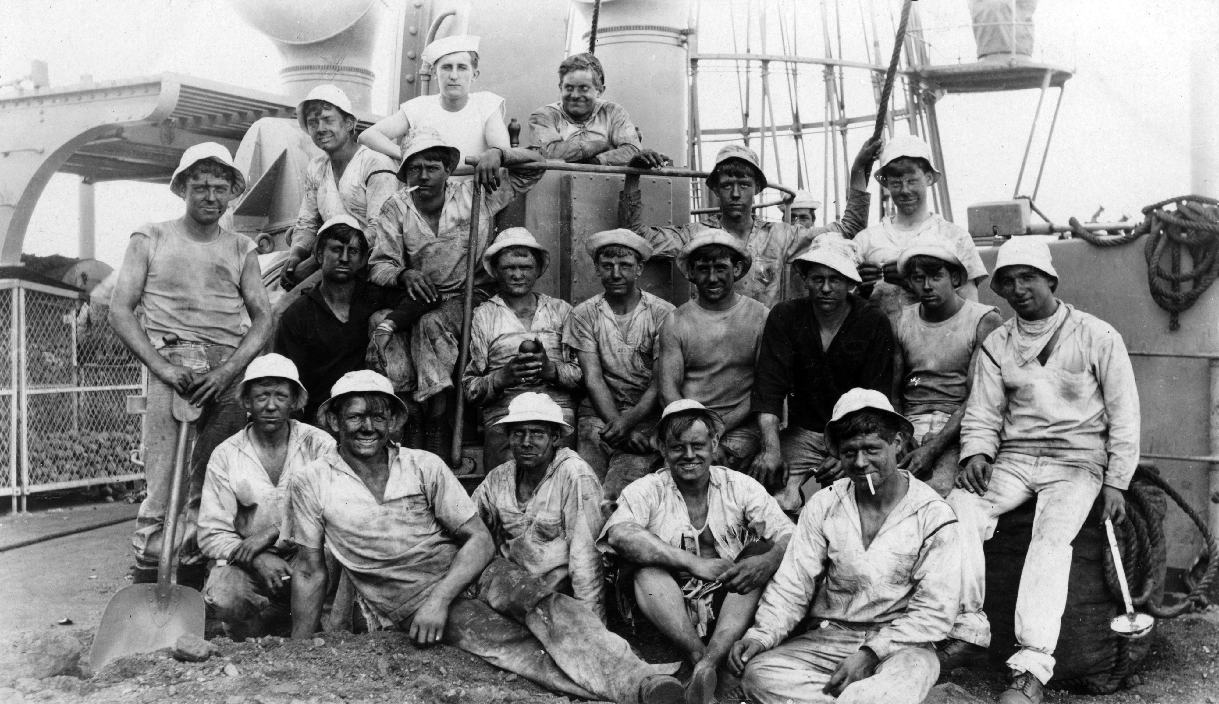 Dusty sailors pose for a photo after coaling ship, possibly on board the battleship Mississippi (BB-23) between 1905 & 10. |