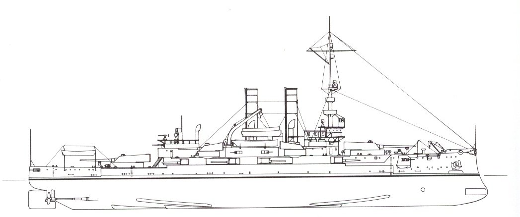 Mississippi (BB-23) as completed, line drawing by A.D. Baker III. |