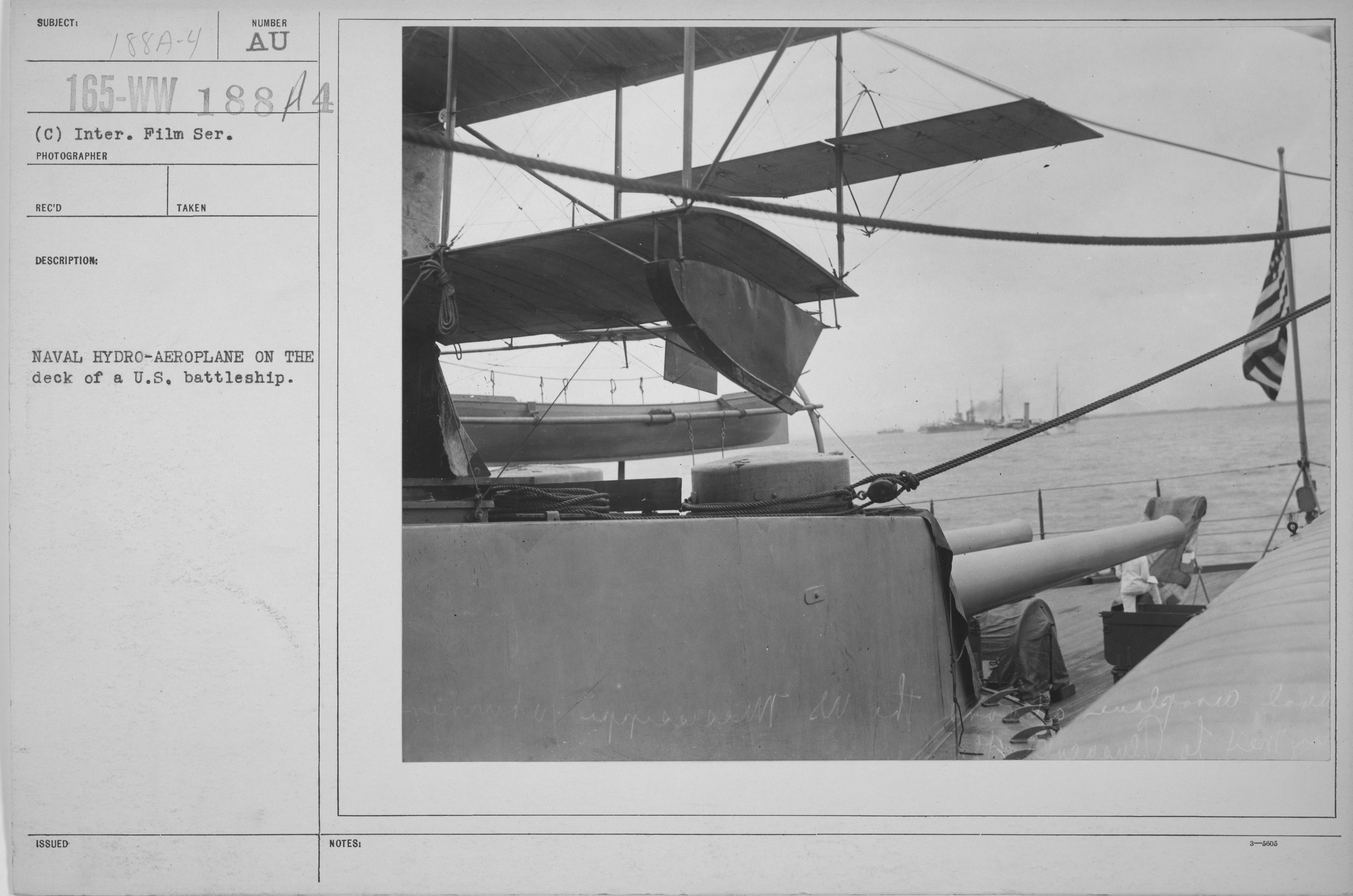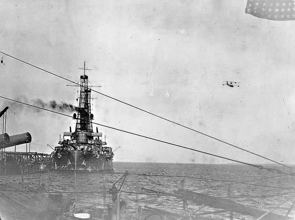 In 1914, during the United States occupation of Veracruz, while flying off the Mississippi (BB-23), Lt. (j.g.) Patrick Nieson Lynch Bellinger became the first American to encounter enemy fire in an airplane, and was recommended for the Medal of Honor. He retired with the rank of vice admiral on 7 July 1947. | USN photo courtesy of Bill Gonyo. | ![]() 1.80k | NAVAL HYDRO-AEROPLANE ON THE deck of a U.S. battleship. | My guess would be the Mississippi (BB-23). Photo courtesy of Record Group 165, ARC Identifier 31485797,National Archives Catalog.