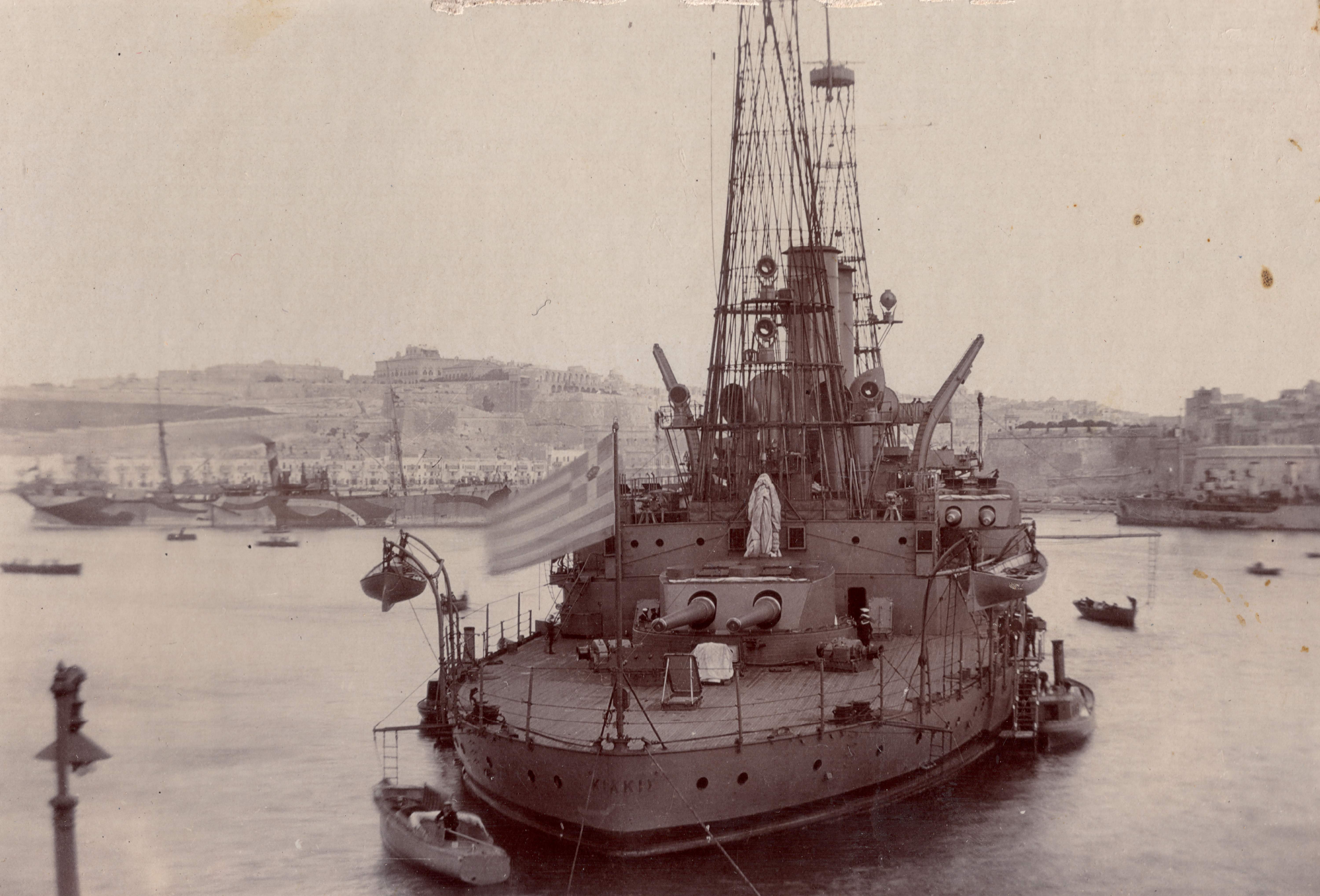 Royal Hellenic Navy battleship Kilkis, possibly just off Senglea, in the Grand Harbour, Malta in late 1917 or early 1918. |