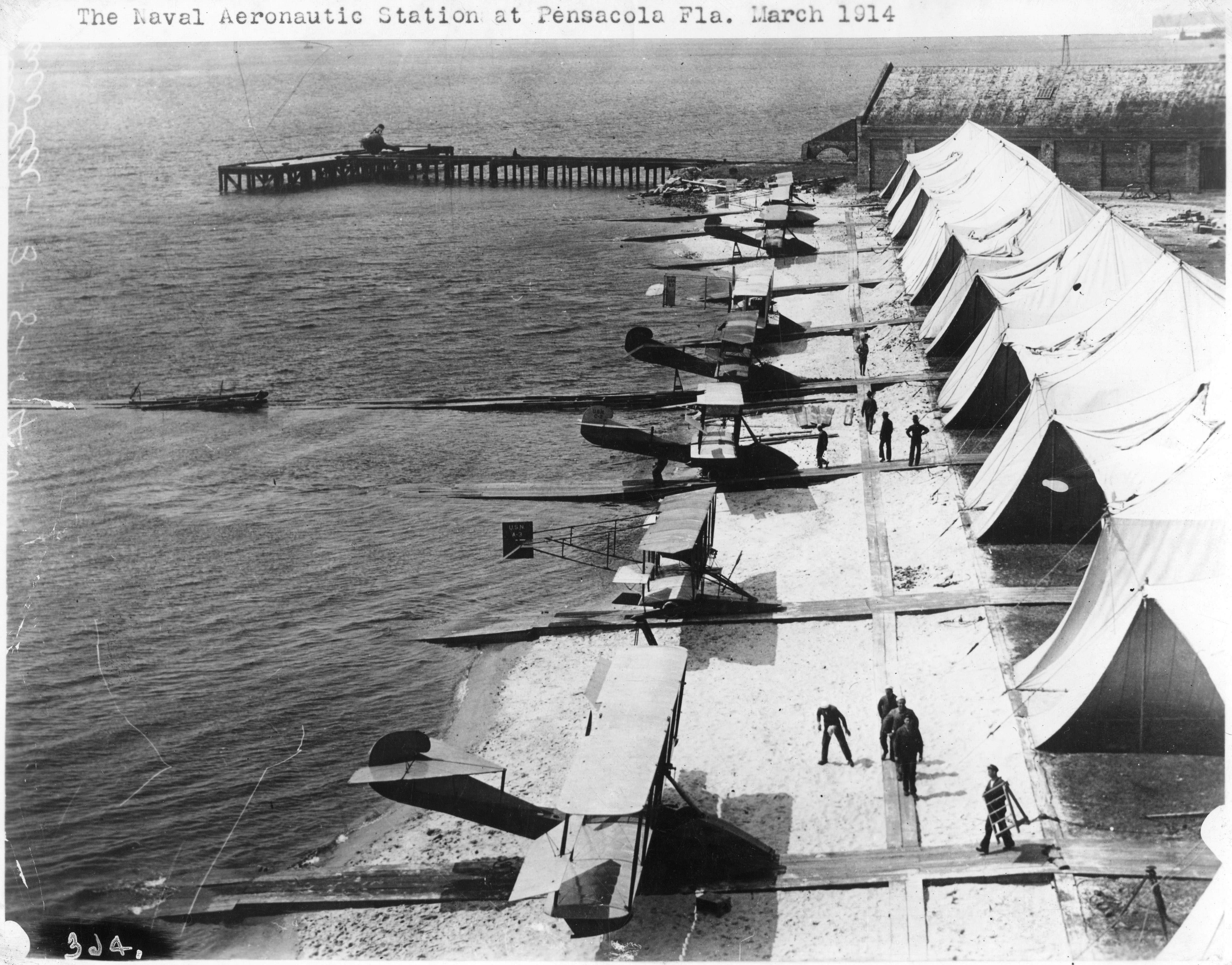 The Navy Department has decided to make permanent the recent establishment at the naval station, Pensacola,Fla., of the United States navy aeronautic station, according to an announcement made yesterday by Capt Mark Bristol, on special duty at the Navy Department in connection with aviation. Lieut. Commander H. C. Mustin has been detailed in charge of the station, which includes the old battleship Mississippi (BB-23) as aeronautic ship, and Lieut. John H. Towers will in future be in charge of the flying school of the station. Other officers have been detailed to establish storehouses and repair shops, and the officers who have already become expert fliers are assisting Lieut. Towers in training other officers and men. Officers at the Station The commissioned officers now on duty at the aviation base at Pensacola include (left to right); Lieutenant V. D. Herbster, Lieutenant W. M. McIlvain, Lieutenant P. N. L. Bellinger, Lieutenant R. C. Saufley, Lieutenant J. H. Towers, Lieutenant Commander H. C. Mustin, Lieutenant (Army) B. L. Smith, Ensign de Chevalier, and Ensign M. L. Stolz. Image and text provided by Library of Congress, Washington, DC. | Photo from Evening Star. [volume] (Washington, D.C.) 1854-1972, 15 March 1914, Image 11, via chroniclingamerica.loc.gov. ![]() 012359 NR | TWO AERIAL CRAFT WHICH UNCLE SAM WILL USE AGAINST MEXICO IF ACTUALY WAR BREAKS OUT |