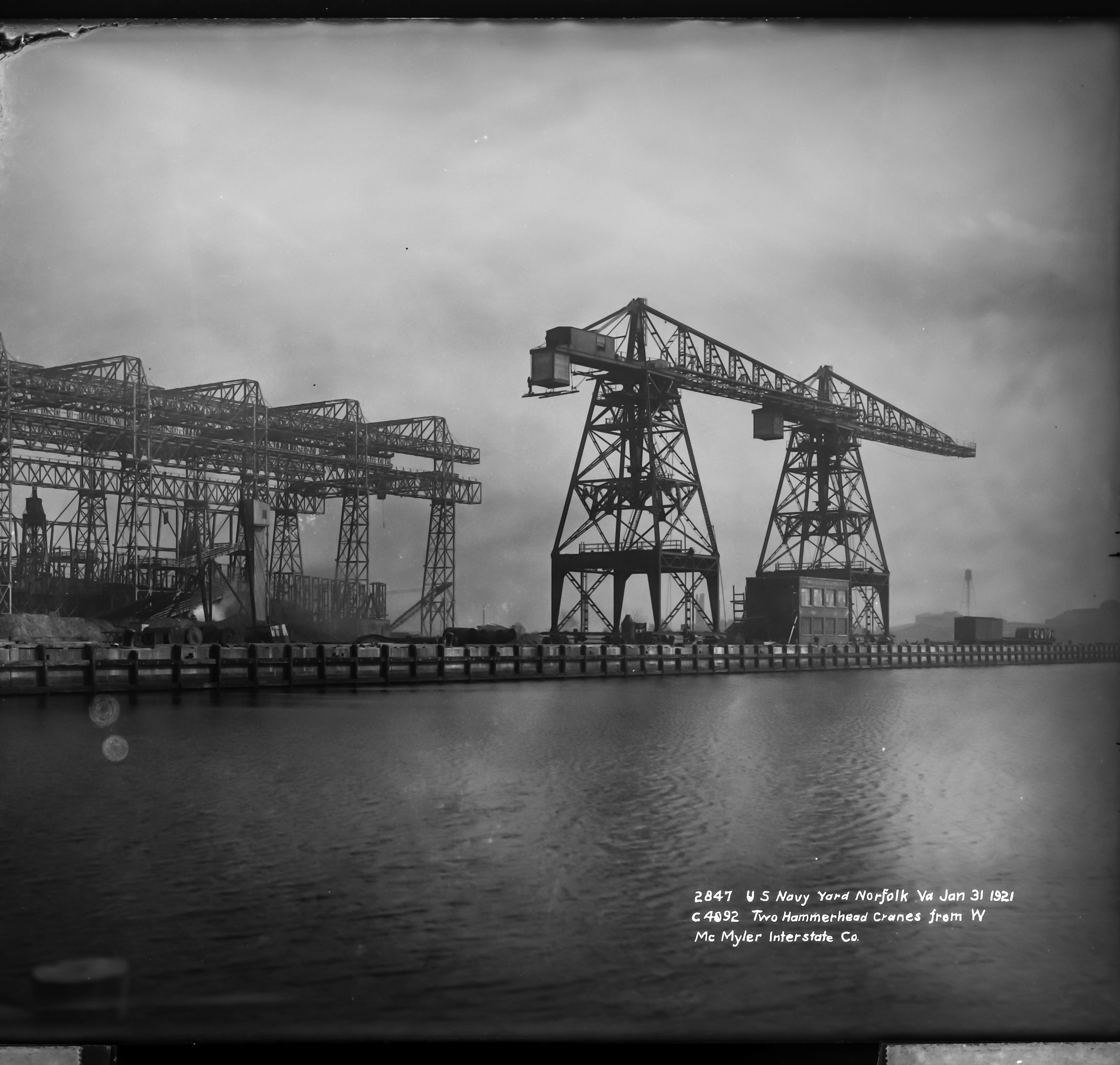 1.54k | U.S. Navy Yard, Norfolk, Va., C-4092, Two hammerhead cranes from west, McMyler Interstate Co. 31 January 1921. | National Archives Identifier: 52559893 Local Identifier 181-V-2847. Photo courtesy of catalog.archives.gov via Daniel Hacker. | |