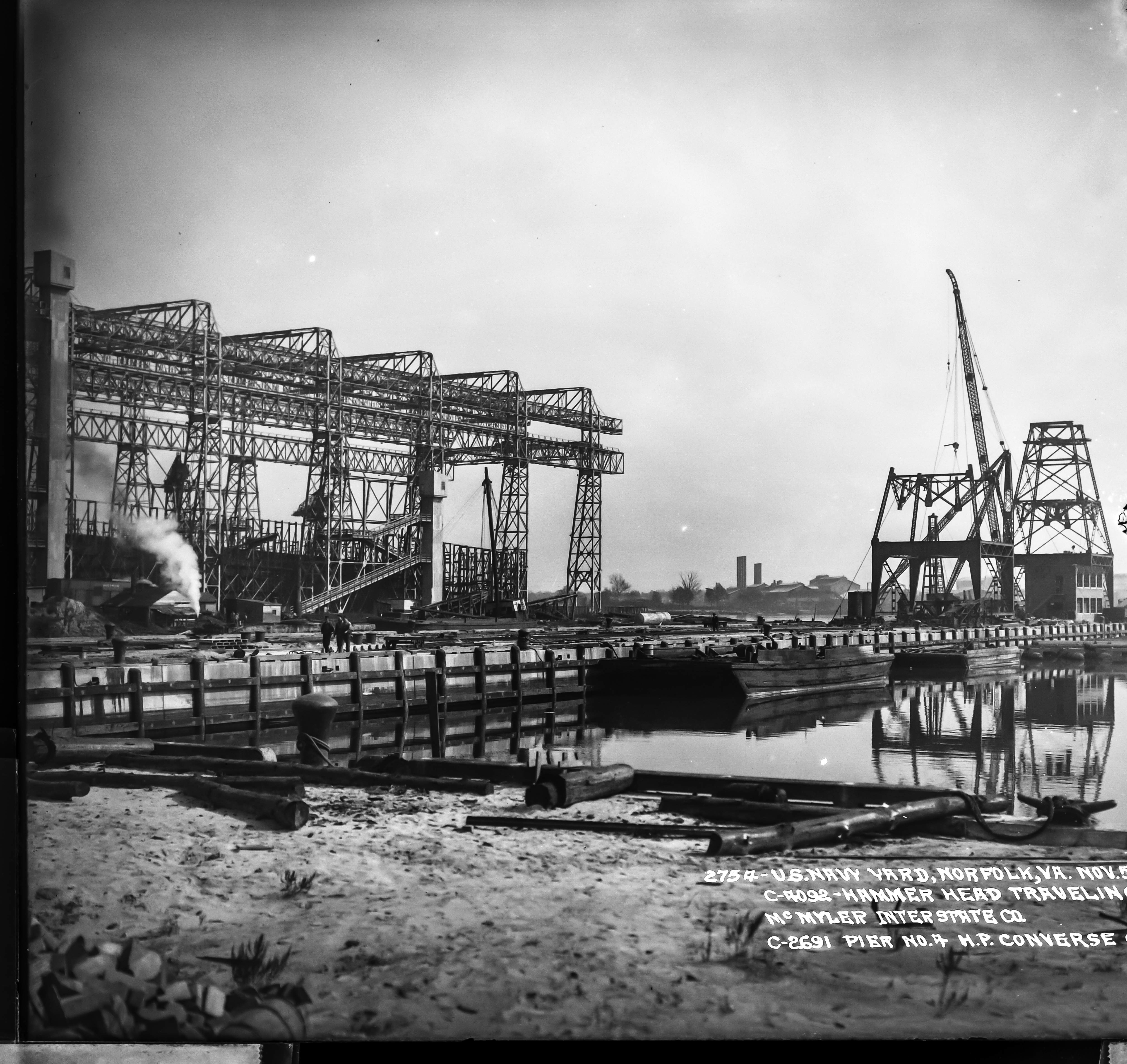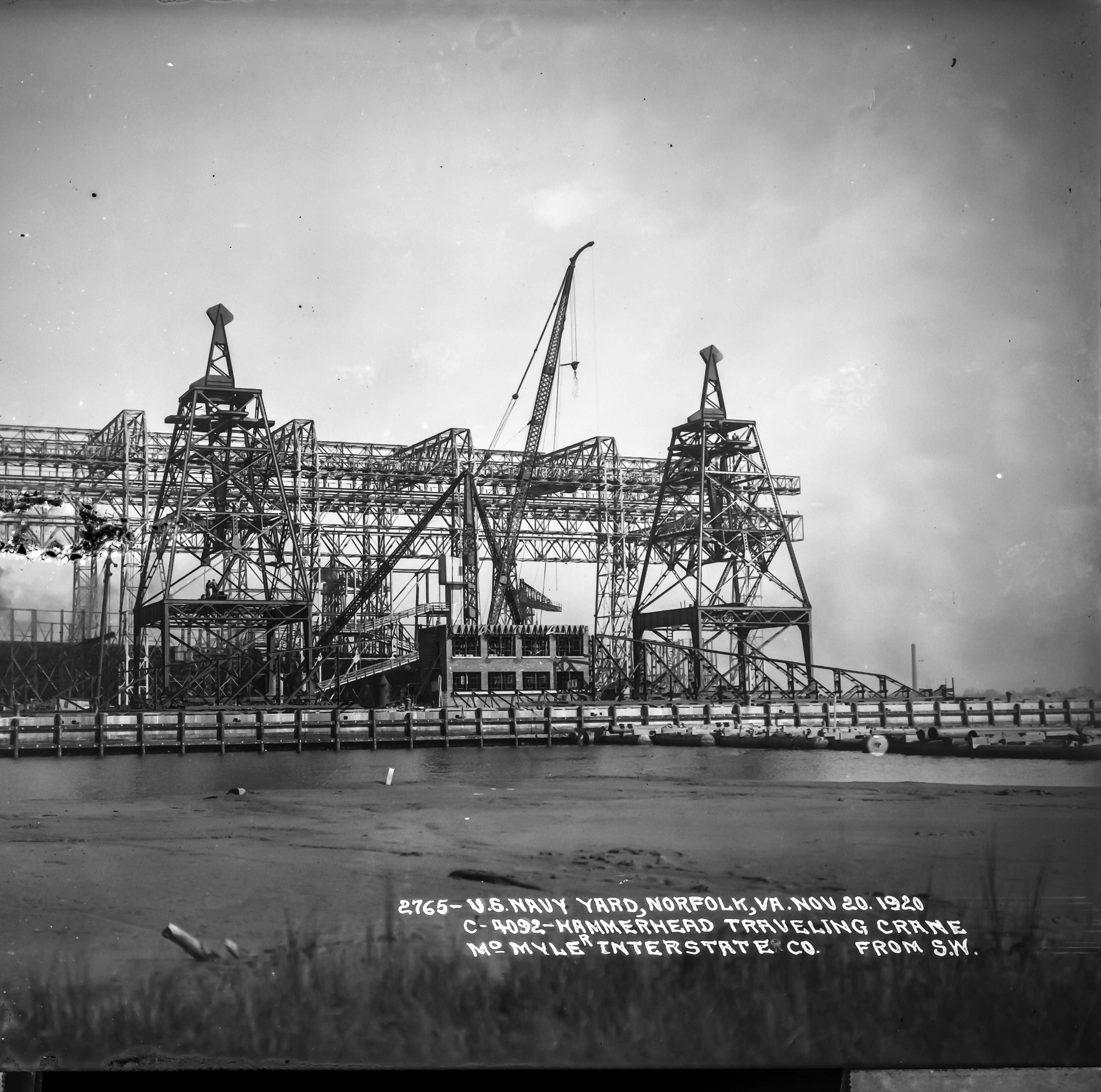 1.83k | U.S. Navy Yard, Norfolk, Va., Hammer Head Traveling Crane from west, McMyler Interstate Co., Cont. #4092, Pier No. 4, H.P. Converse Co., Cont. #2691, 11 May 1920. | National Archives Identifier: 52559713 Local Identifier 181-V-2754. Photo courtesy of catalog.archives.gov via Daniel Hacker. | |