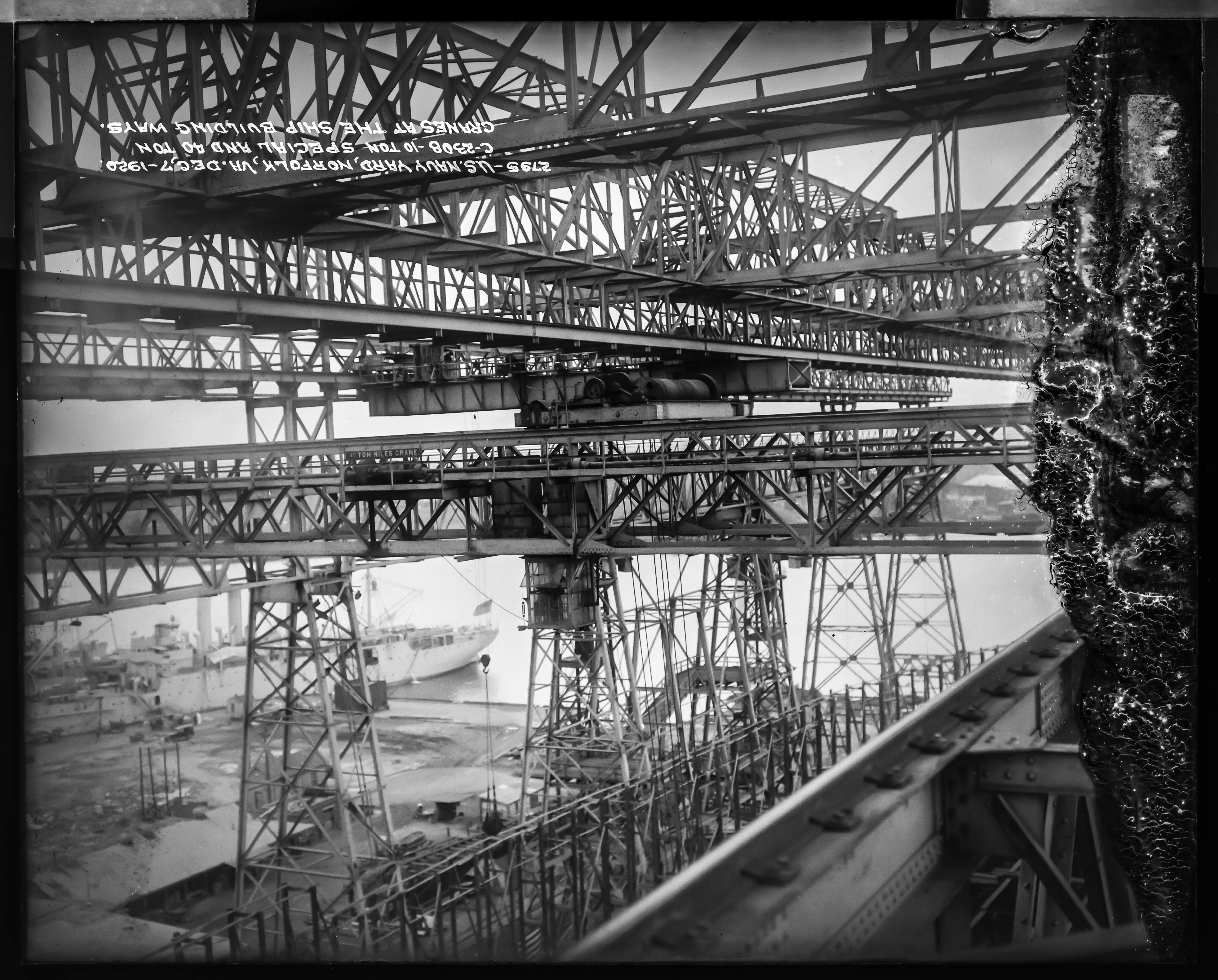 2.26k | U.S. Navy Yard, Norfolk, Va., 10 Ton Special 40 ton Cranes at the Ship Building Ways, Cont. #2308, 7 December 1920. | National Archives Identifier: 52559795 Local Identifier 181-V-2795 Photo courtesy of catalog.archives.gov via Daniel Hacker. | |