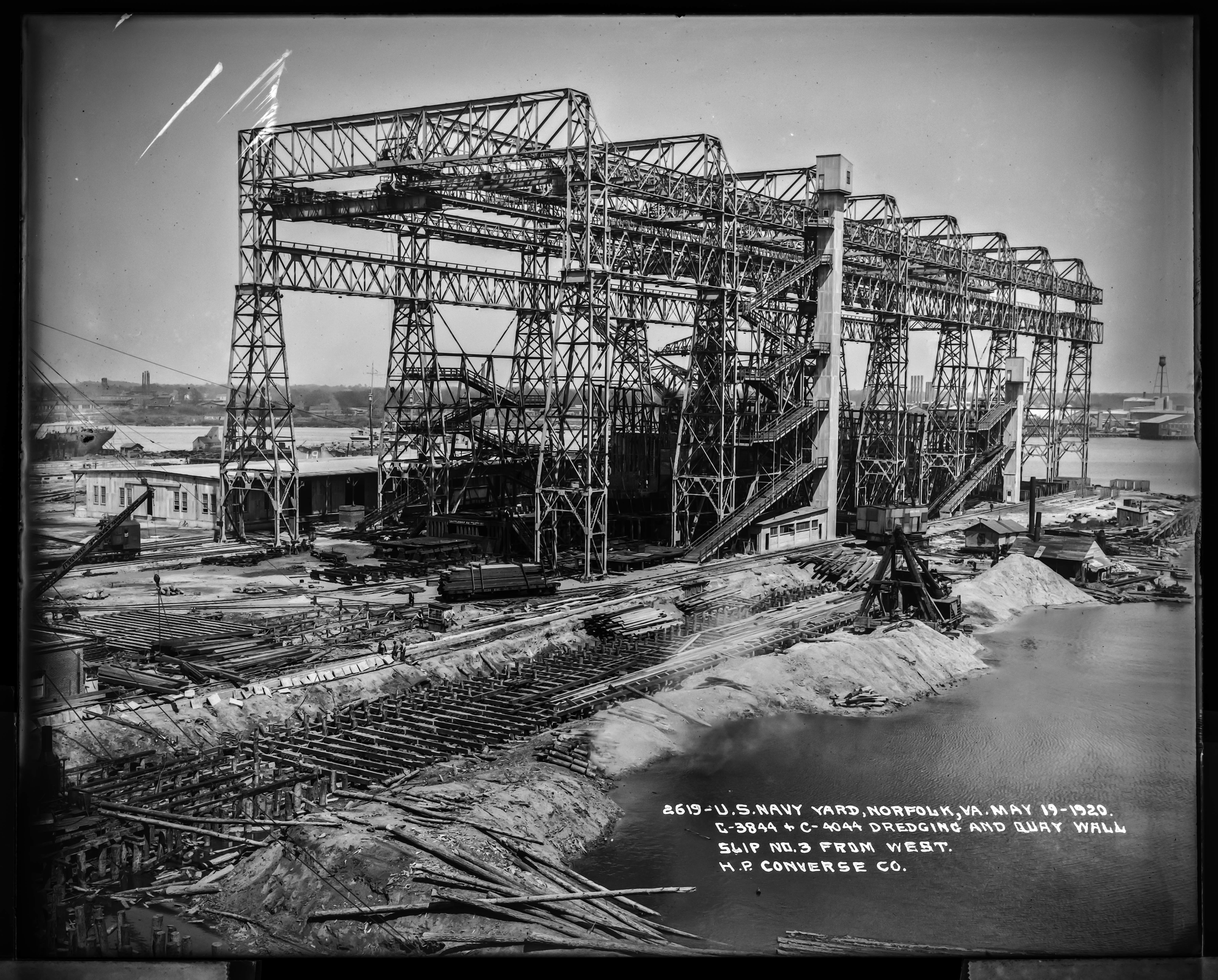 3.20k | U.S. Navy Yard, Norfolk, Va., C-3844 and C-4044 dredging and quay wall slip No. 3 from the west, H.P. Converse Co, 19 May 1920. | National Archives Identifier: 52559447 Local Identifier 181-V-2619. Photo courtesy of catalog.archives.gov via Daniel Hacker. | |