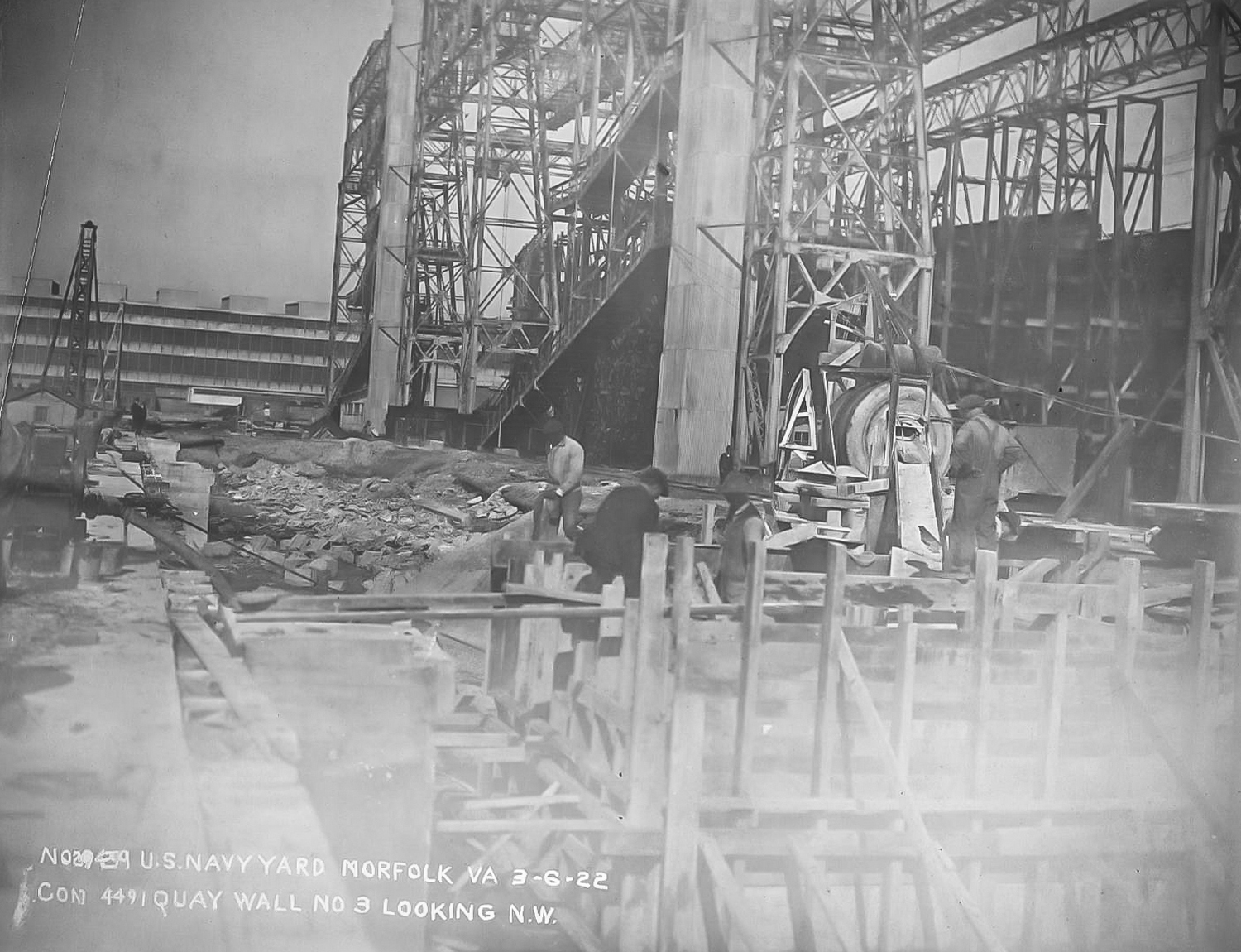 813k | U.S. Navy Yard, Norfolk, Va., Quay wall No. 3 looking south, Cont. #4491, 6 March 1922. | National Archives Identifier: 52559983 Local Identifier 181-V-2929. Photo courtesy of catalog.archives.gov via Daniel Hacker. | |