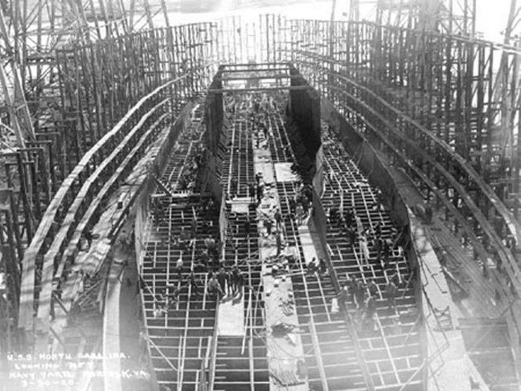 101k | On the building ways at Norfolk Navy Yard, VA. View from the bow looking aft, 24 April 1920. | NARA (National Archives Record Administration) photo courtesy of battleshipnc.com. | |