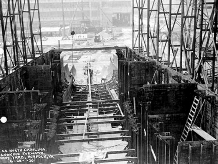109k | On the building ways at Norfolk Navy Yard, VA. View from forward of the bow looking aft, 29 September 1920. | NARA (National Archives Record Administration) photo courtesy of battleshipnc.com. | |