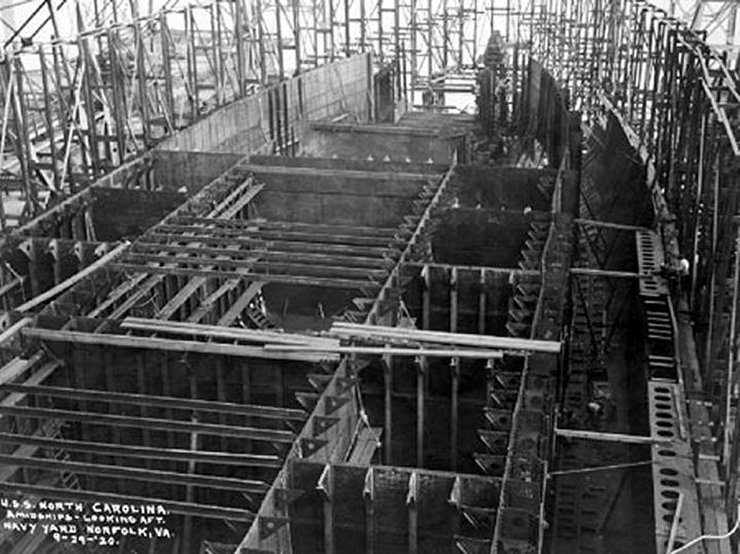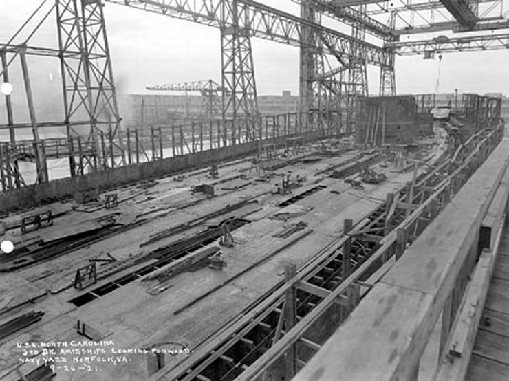 90k | On the building ways at Norfolk Navy Yard, VA. View of the third deck amidships looking aft, 26 September 1921. | NARA (National Archives Record Administration) photo courtesy of battleshipnc.com. | |