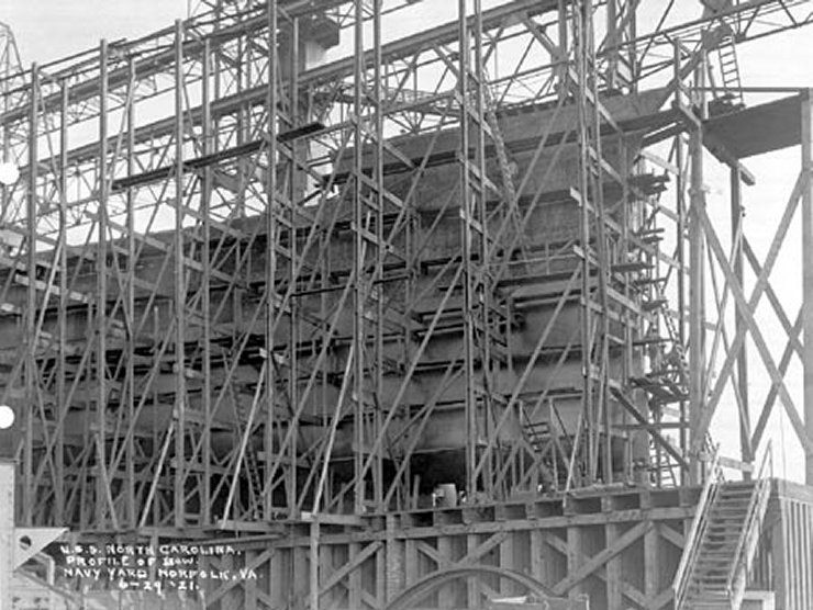 108k | Profile of bow on building ways at Norfolk Navy Yard, VA., 29 June 1921. | NARA (National Archives Record Administration) photo courtesy of battleshipnc.com. | |