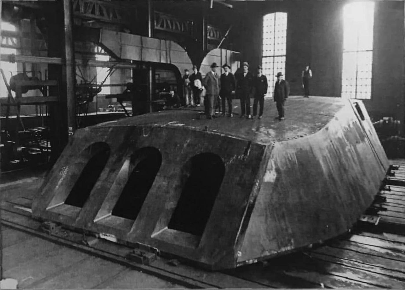 ![]() 015405 | 441k | One of the turret shells of Massachusetts (BB-54) at the Bethlehem Steel factory, 1920's. | Photo courtesy of 64.media.tumblr.com via Daniel Hacker. | |