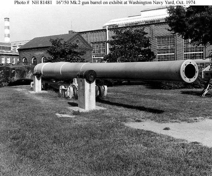 181k | Sixteen-inch, 50 Caliber, Mark 2, Mod. 1 Gun Barrel On display in East Willard Park, Washington Navy Yard, D.C., in October 1974. This gun is Number 111, built at the Washington Navy Yard in 1922 for planned installation on the abortive South Dakota class (BB-49 /54) battleships and Lexington (CC-1-6) class battle cruisers. Note railway trucks supporting the gun barrel. The two sixteen-inch projectiles displayed alongside the gun are inert shells fired by New Jersey (BB-62) into San Clemente Island, California, during shore bombardment practice in 1968. | USN Historical Center # NH 81482 | |