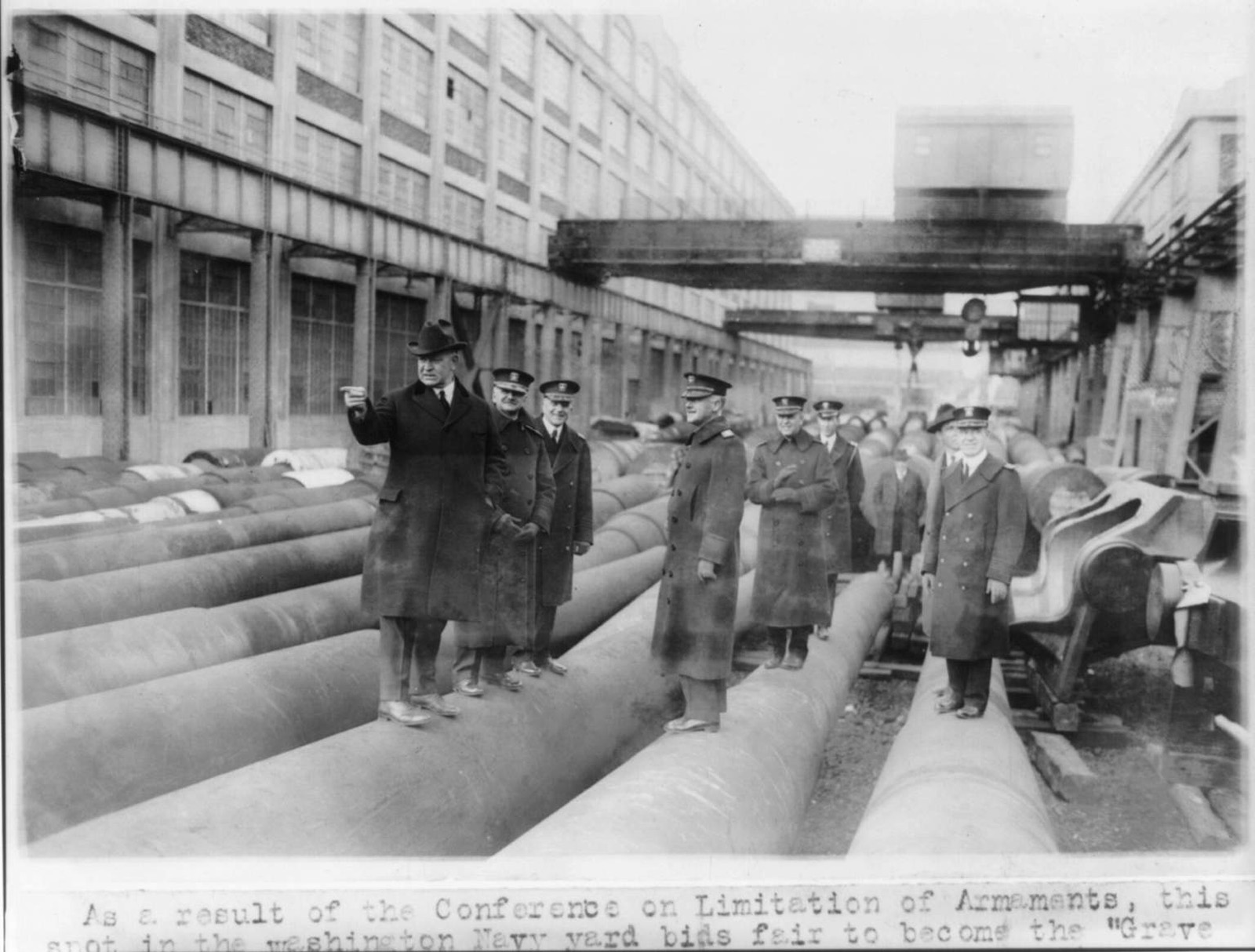 NR | SECRETARY DENBY MAKES TOUR OF INSPECTION OF WASHINGTON NAVY YARD. As a result of the conference on limitation of armament, this spot in the Washington navy yard may become the "graveyard" of the Navy Department. Photograph shows finished guns of various calibers. Intended for battleships yet to be built by Uncle Sam. The Secretary is accompanied by Admiral Coontz, chief of naval operations; Admiral McVay, chief of the bureau of ordnance, and other Navy officials. | Image and text provided by Library of Congress, Washington, DC. Photo & text by Evening Star.([volume] (Washington, D.C.) 1854-1972, 19 December 1921, Image 2, courtesy of chroniclingamerica.loc.gov. | |