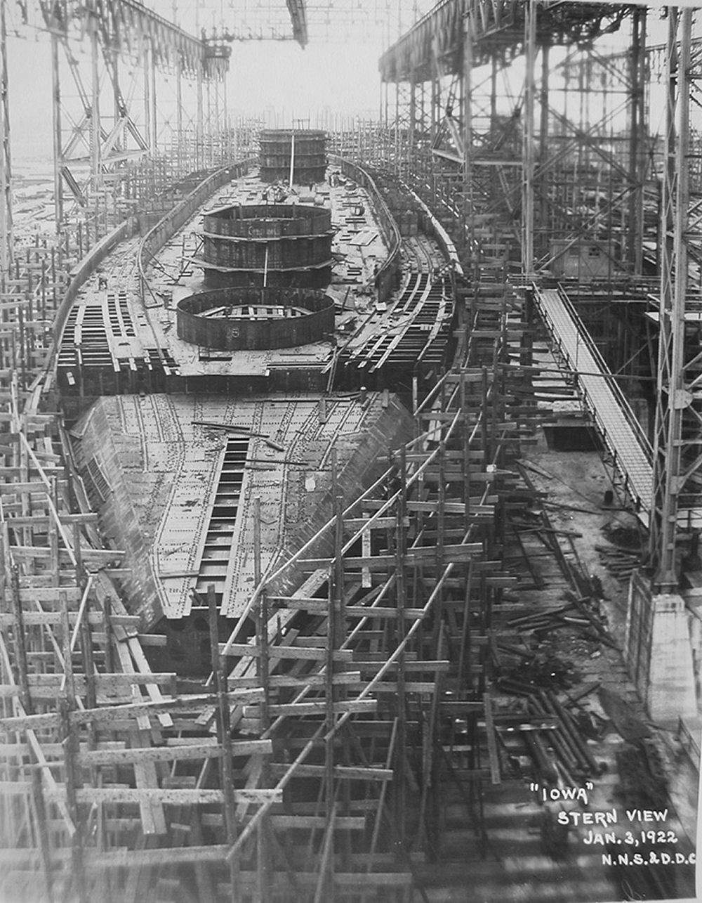 232k | Iowa's (BB-53) third deck is almost completely built in this view looking forward from her bow at Newport News Shipbuilding & Drydock Co., 1 October 1921. | Photo from National Archives & Record Administration (NARA), Record Group (RG-19-LC) Box 22. Courtesy of Dan Treadwell. | |