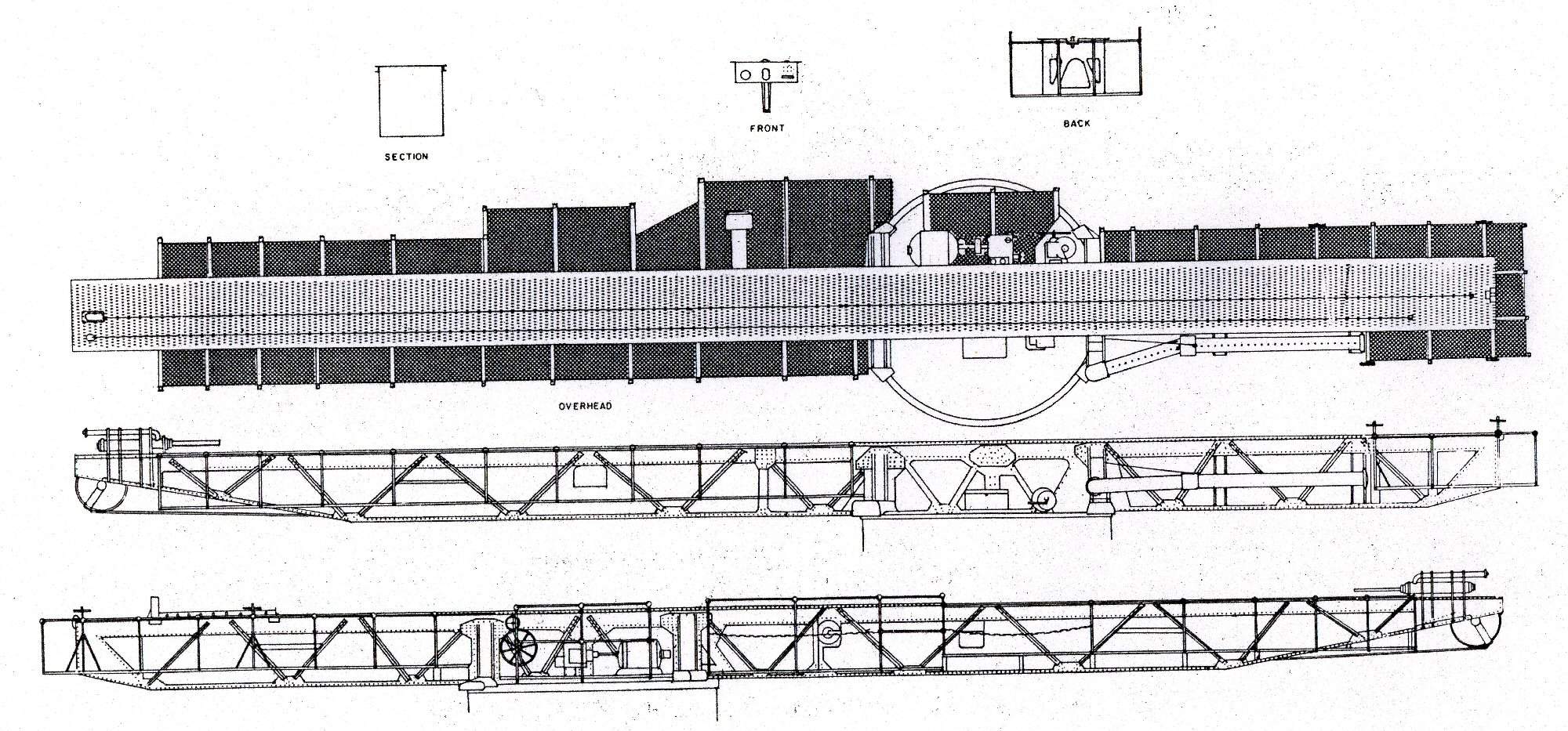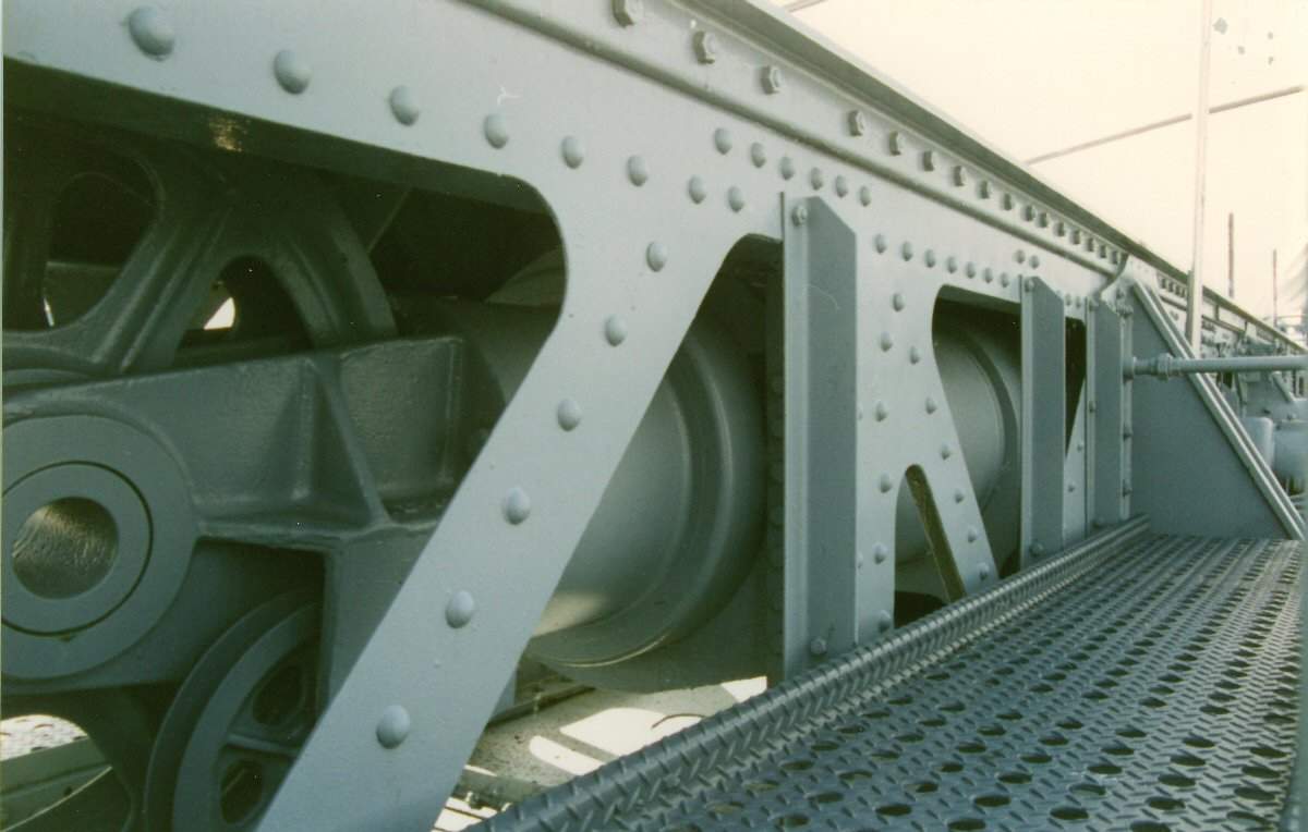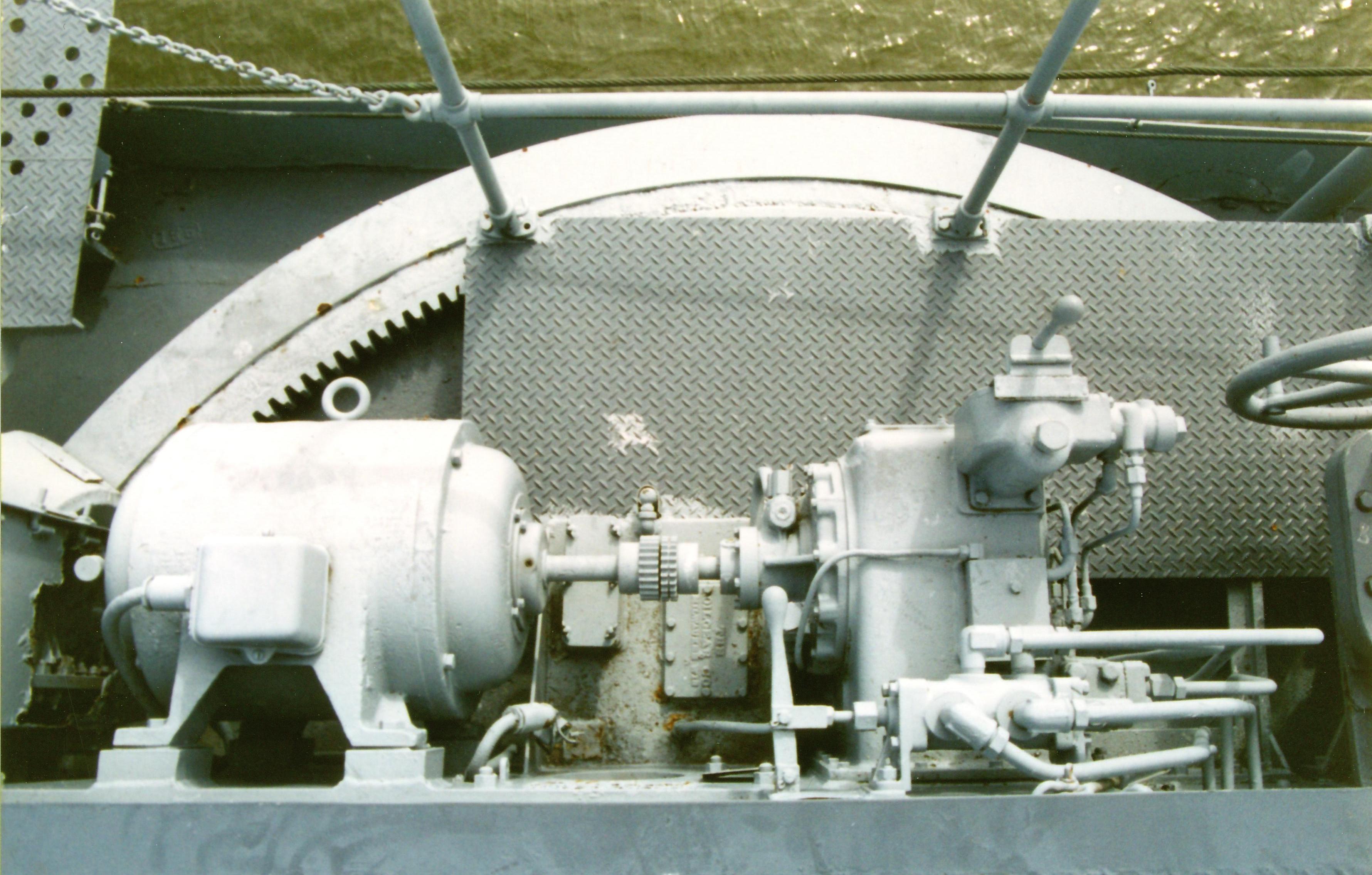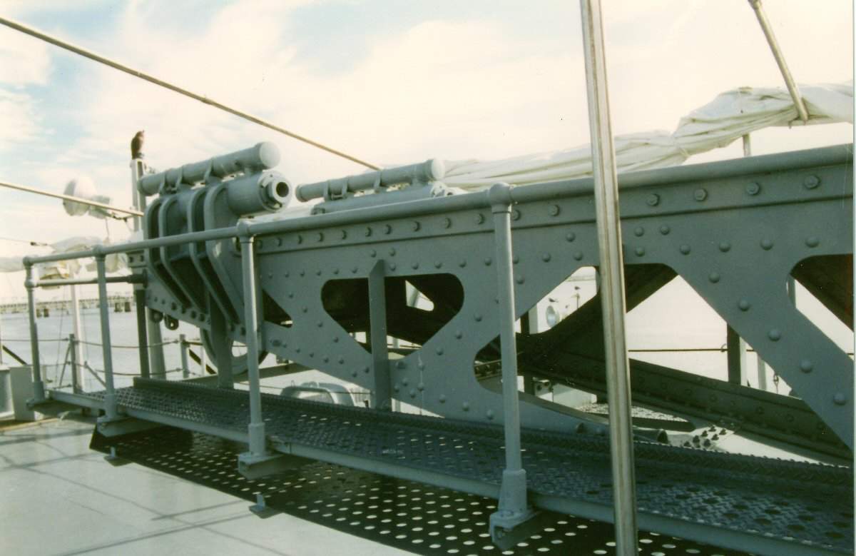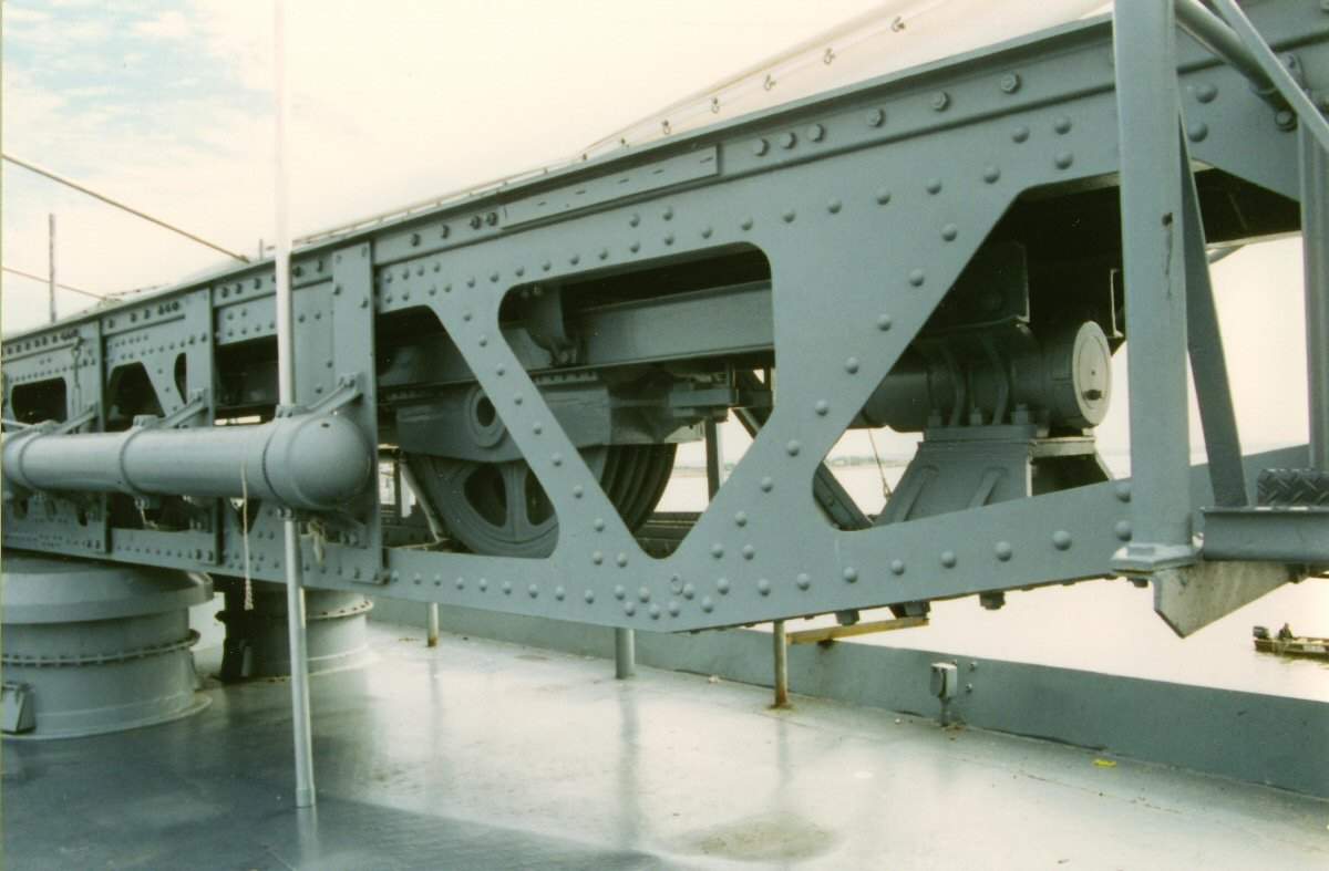 95k | AIRCAFT STOWAGE Note: All photos were taken aboard the Alabama (BB-60) by Pieter Bakels in 1993. Type P Mark 6 catapult with gun Mark VI Modification 1. It was necessary to mount the aircraft float in a slightly nose-down attitude in order to allow the keel to leave the launching car without structural interference at the end of the catapulting run. As a result, the angle of attack was small and at the instant the aircraft left the car was but a small fraction of the weight. Consequently, if the elevator control was held in neutral, the aircraft lost altitude rapidly and could strike the water. If the control stick was moved sharply backward during this descent, the angle of attack was decreased so that the lift was somewhat greater than the weight, but the downward motion was not immediately checked because of the downward momentum that had been attained. Both of the foregoing methods of control were obviously objectionable. However, extensive experience had shown that when the control stick was held well back during the entire launching run, there would be a minimum delay in increasing the angle of attack at the end of the run and a minimum loss of altitude. This control was recommended in all cases, especially with fully loaded aircraft and with little or no head wind. As soon as the aircraft was flying level or climbing, the pilot had to ease the control stick forward and exercise all controls as under normal conditions. The aileron and rudder positions were less important than the elevator position but had to be noted. The ailerons were normally kept in neutral and the rudder in the normal flight position. In general, flaps would be in full down position during a launch unless instructions to the contrary had been issued. Elevator tabs, if installed, would be in neutral or set to produce a slightly tail-heavy condition. The adjustable stabilizer, if installed, would be set to produce a slightly tail-heavy condition. Rudder tab, if installed, had to be set in neutral. A water rudder, if installed, had to be disconnected at the time of catapult launching. When not in use, the breech mechanism had to be kept closed and covered by a canvas cover. The firing mechanism had to be removed from the breechblock after firing, and assembled in place only when aircraft were to be launched or no load shots were to be fired. When in place, the firing mechanism had to be locked by the safety latch until ready to fire. In catapult guns Mk.VII and Mk.VI Mod.1 the powder gases when leaving the exhaust casing entered the blast reducer, which consisted of an eight-inch pipe with holes spaced on its upper side throughout its entire length. The gases expanded in the blast reducer and escaped through the holes with reduced velocity. The cartridge case used was the 5-inch, Mk.III. The primer was Mk.XIV Mod.1. The ignition charge of three hundred gram of black powder was contained in a silk bag, made up in doughnut form and placed around the primer at the bottom of the case. The smokeless powder charge was placed on top of the ignition charge. On top of the powder came a pyralin washer and then the distance piece. The mouth of the case was sealed by a cork plug which was pushed down on the distance piece. The contents of the cartridge were stencilled on the case, and a powder tag was attached to the distance piece. The launching cable consisted of a 1-1/8 inch ungalvanized wire rope, comprising six strands of thirty-seven wires to the strand and a hemp core. As the wire rope was not galvanized, special attention had to be paid to keeping it well greased and free from dust. The seaplane was accelerated to flying speed on a launching car, guided along the catapult by means of tracks. The launching car was equipped with slipper shoes which provided the necessary bearing surfaces for the car and the load to slide down the track. The slipper shoes were made of a phenolic composition that required the catapult track to be free from corrosion and pitting both on the upper and lower surfaces. When the track was kept highly polished on all its surfaces the composition slipper shoes lasted much longer than the metal slippers of the same dimensions. Preparatory to launching, the car was secured in battery position by a tension ring and by two safety pins. The tension ring was made of steel and was designed to break at a load less than a given amount under the combined load of the preliminary tension in the main cable and the pull of the propeller running with wide open throttle. After the aircraft and launching car were in battery position and the tension ring and safety pins were in place the tensioning mechanism had to be used to obtain the preliminary tension in the main cable. The engine would then be warmed up and run full out. After the engine had run with open throttle an attempt had to be made to pull out the safety pins. If they came out and went back readily, the tension ring was considered as checked against defects. Actual release of the launching car was effected by the automatic breaking of the tension ring when the launching car started down the track. The aircraft was held on the launching car by means of the "J" hooks on the saddle and the release lever rotating out and down from in front of the towing fitting after the launching car had moved forward approximately one foot, and the "J" hooks permitted the float to slide forward while the car was being stopped by the buffers. The launching car was stopped at the end of its run by two hydraulic track buffers mounted on the catapult structure. The function of the small car buffers was to reduce the shock of the impact with the large track buffers. Each car buffer was prevented from creeping back into the cylinder during a launching by a snap ring installed in the cylinder head, which gripped the piston rod in a shallow groove. The mechanism training the catapult and retracting the launching car consisted of an electric motor and controller, with a 