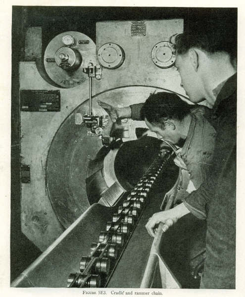 ![]() | 268k | View inside a main battery turret; In red - the rammer chain casings. | USN photo from publication "Ammunition Handling"- NavPers 16194- U.S.Government Printing Office, courtesy of Pieter Bakels. | |
