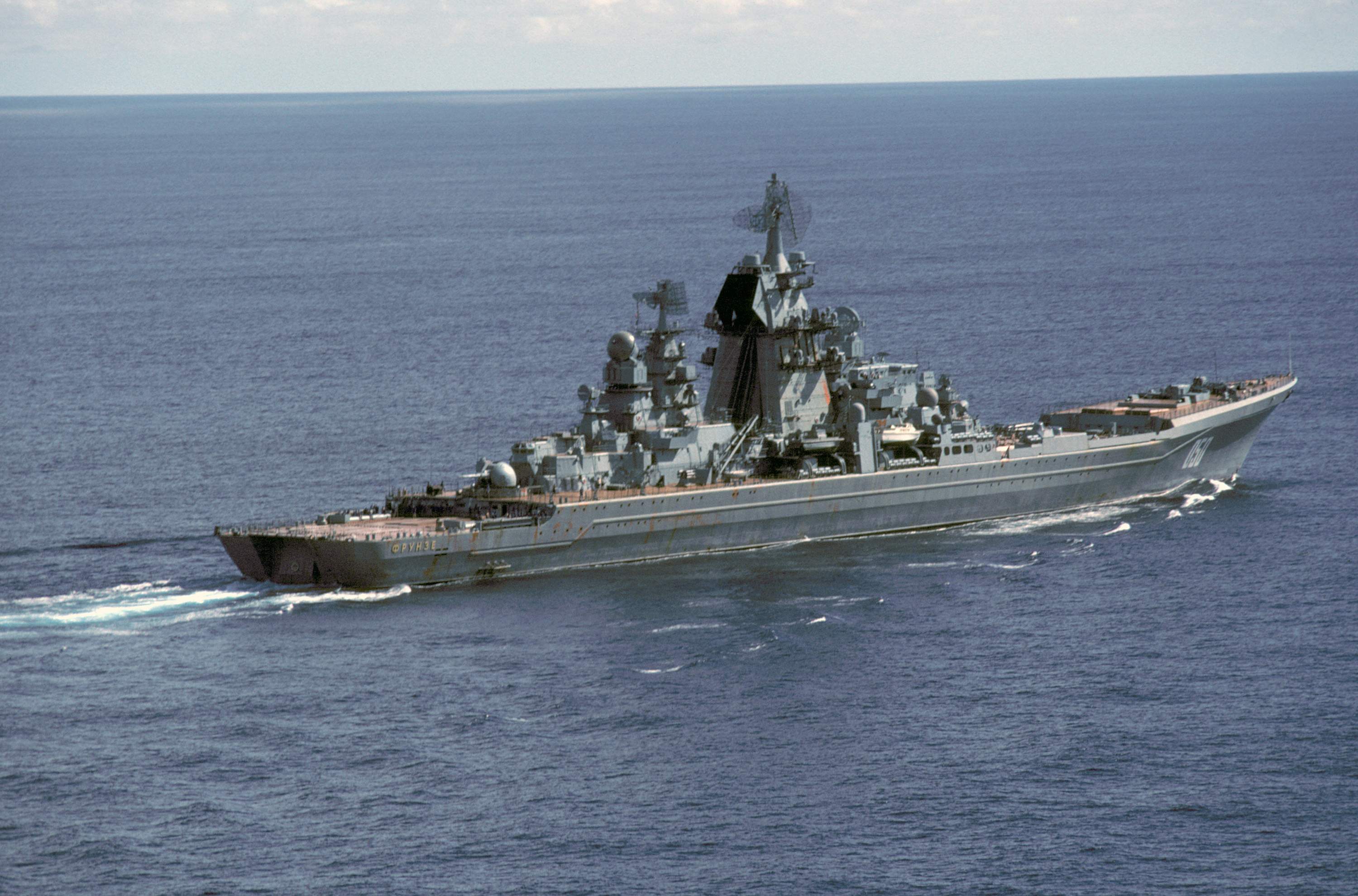 In 1980 Ronald Reagan won a landslide election. He promised to revive American power and the American economy and to stop the Soviet advance. The former president Carter had obviously failed to do both. President Reagan insisted that the issue was not a long-term competition with the Soviets but what it had been in 1946: a fight to the finish between the free West and a Soviet Russian Communist system bent on enslavement, a thing he called the "Evil Empire". The president and George Shultz, his secretary of state, revived the old idea of the 1940's and 1950's, that the Soviets were expansionist abroad because they were unaccountable at home. Reagan probably was convinced that he could win the cold war by his new director of central intelligence, William Casey, a veteran of the World War II Office of Strategic Services and even before Reagan was inaugurated, chairman of his Interim Foreign Policy Group. He convinced Reagan that the Soviets were already in such deep economic trouble that, if enough stress was applied, they might, in the president's words, "implode". One of the new ideas, reflected in a Maritime Strategy, evolved since 1979 at the Naval War College, was a return to a more aggressive concept of operations the Navy had espoused in the 1950's and 1960's and this reversed thinking of the 1970's that feared that pressure on Soviet strategic submarines would lead a panicky Soviet leadership to fire before they were lost. They did not realize that the Soviets planned to surge submarines into the Atlantic to split NATO and hunt down U.S. strategic submarines from the outset. The Diesel-electric "Kilo" class with eight 21-Inch torpedotubes and their shorter hull form was well suited to the enclosed waters of the Baltic and was built at Komsomolsk. They appeared in the late 1970's and were intially produced at a rate of one a year. This rate later increased. Non-nuclear submarines construction continued in view of the high quality listening capabilities of these boats. In addition, certain specialised submarines were built. "Kilo" class and "Tango" class operational boats were coated with cluster Guard anechoic tiles and alll had a minelaying capability from their torpedo tubes. Others, many of them of European NATO navies, thought that convoy operations (i.e. direct protection of shipping) surely sufficed; why the dangerous run north? Instead of concentrating on directly protecting the sea route to Europe, the United States would seize maritime supremacy by advancing toward Soviet bases in a crisis, to track and promptly annihilate Soviet warships and submarines, including land-based aircraft in their bases, to prevent them from setting up a first-salvo ambush, keeping the Atlantic safe for NATO. U.S. submarines would attack Soviet strategic submarines, their most valuable naval assets, in their protected holding areas. At the least, that would tie down much of the Soviet submarine fleet, which would try to protect the strategic submarines. All of this was practical because the new administration was buying enough of the new systems developed over the previous decade, such as the F-14 fighter and Aegis. Once the Fleet had triumphed, it could change the dynamics of a war in Europe. It could, for example, afford to undertake risky attacks on the Soviet flanks, for example in the Baltic or on the North Sea coast as a Soviet army advanced through the willing Netherlands. Thus threatened, a Soviet army might have to stop or even pull back. Concern arose that if a fleet arrived close offshore in a crisis, the Soviets might attack it with nuclear weapons. Deterring such an attack became the major reason for nuclear Tomahawk land-attack missiles. Secretary Lehman once told reporters that conventional Tomahawks would destroy Soviet nuclear missile-carrying bombers at their bases. Tomahawk strikes could come from any coast or direction. Most Soviet air defenses could not detect Tomahawks and indeed air defense facilities would themselves be targets as they were in Iraq, to clear routes for bombers to penetrate inland. Other strategic targets would be ballistic missile submarine bases and ammunition depots. With Tomahawk, the United States could launch strategically destabilizing raids without nuclear weapons. A Battleship Surface Action Group with Ticonderoga class cruisers might proceed as a surface action group far ahead of other forces to attack Soviet barrier ships such as the Kiev classes (pictured here is the Soviet Aircraft Carrier Baku with Kamov Ka-27 helicopters and Yak-38 visible on her deck)& Kirov classes [pictured here is an aerial starboard quarter view of the Soviet Kirov class guided missile cruiser Frunze underway] with Tomahawk anti-ship missiles. Surface action groups could attack ground targets from 700 miles' range, forcing the Soviets to dilute their surveillance and attack forces away from aircraft carriers. Nuclear Tomahawk land-attack missiles became operational in June 1984. As a national strategic asset, Tomahawk was a reserve weapon for trans-attack and post-attack coercion of surviving Soviet authorities. As a theatre reserve nuclear weapon in NATO and the Far East, it was a deterrent against any Soviet hope of pre-emptively destroying all U.S. nuclear forces. Most important, since carrier battle group escorts could attack Soviet bases and command posts with nuclear Tomahawks, this weapon removed any perception on the part of the Russians that they might attack aircraft carriers with nuclear weapons and get away without nuclear retaliation. At the time it was known that the Soviets took the threat of amphibious operations, even in places like the Kola Peninsula in the North and near Leningrad very seriously. This credible threat forced the Soviets to hold back large forces, which would otherwise have been used on the Central Front. The U.S. Navy bought new air-cushion landing craft which could operate over a far wider variety of beaches than their predecessors, h