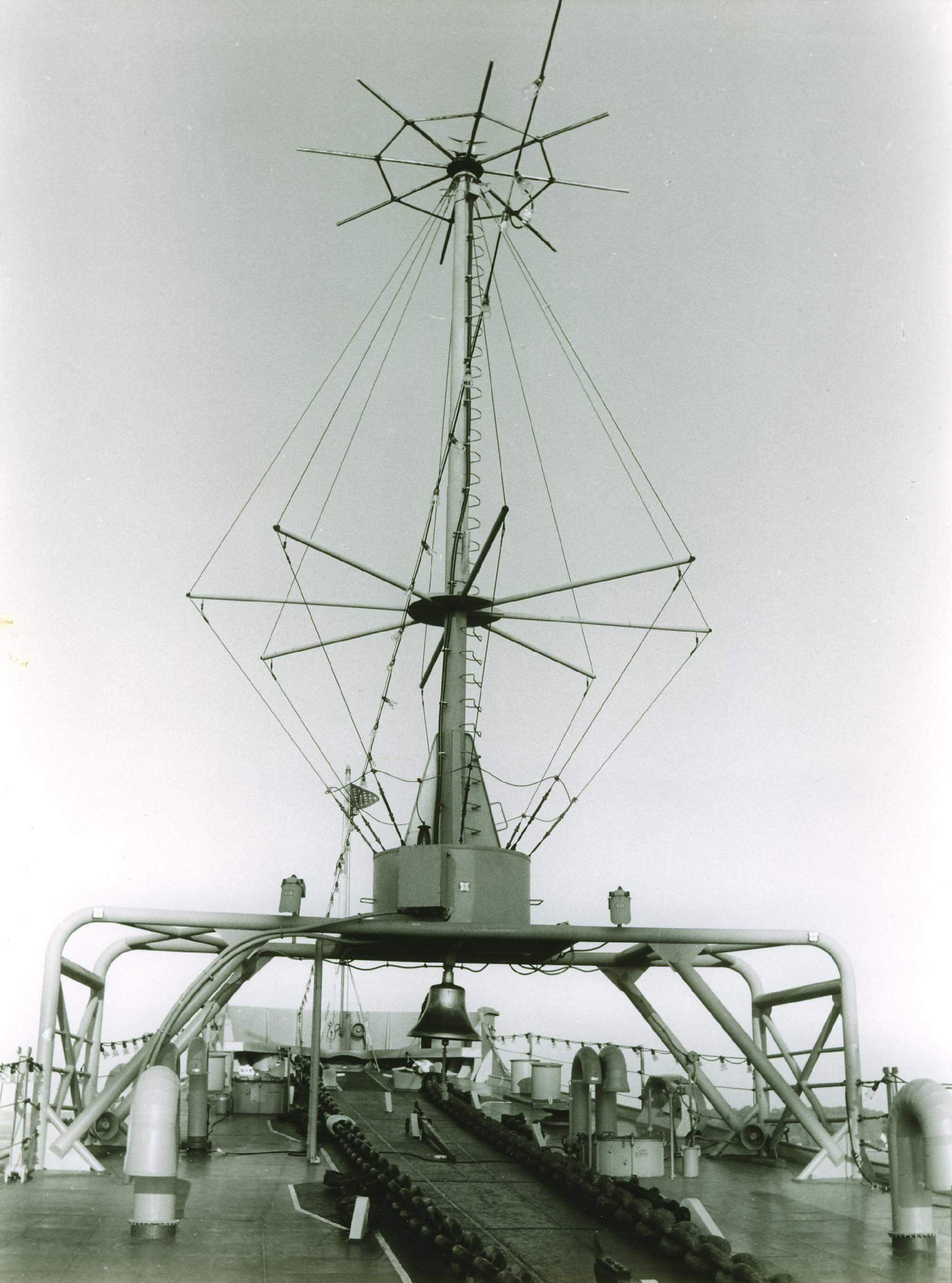 ![]() | 375k | View of the Iowa's (BB-61) bow section; conical-monopole high frequency antenna anchor chain & ship's bell while at Kiel in the Federal German Republic in 1985 during (Baltops"85). | Photograph courtesy of Pieter Bakels via Fred Willshaw. | |