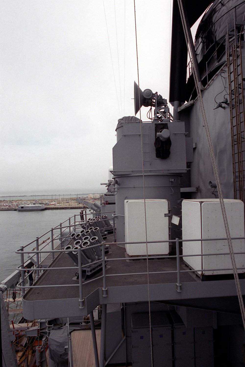 ![]() | 123k | A starboard view looking aft of the secondary battery director, the forward stack and the super rapid blooming offboard chaff launchers on the battleship Iowa (BB-61). | Official USN photo # DN-SC-86-09512, by PHC Jeff Hilton, from the Department of Defense Still Media Collection, courtesy of dodmedia.osd.mil. | |