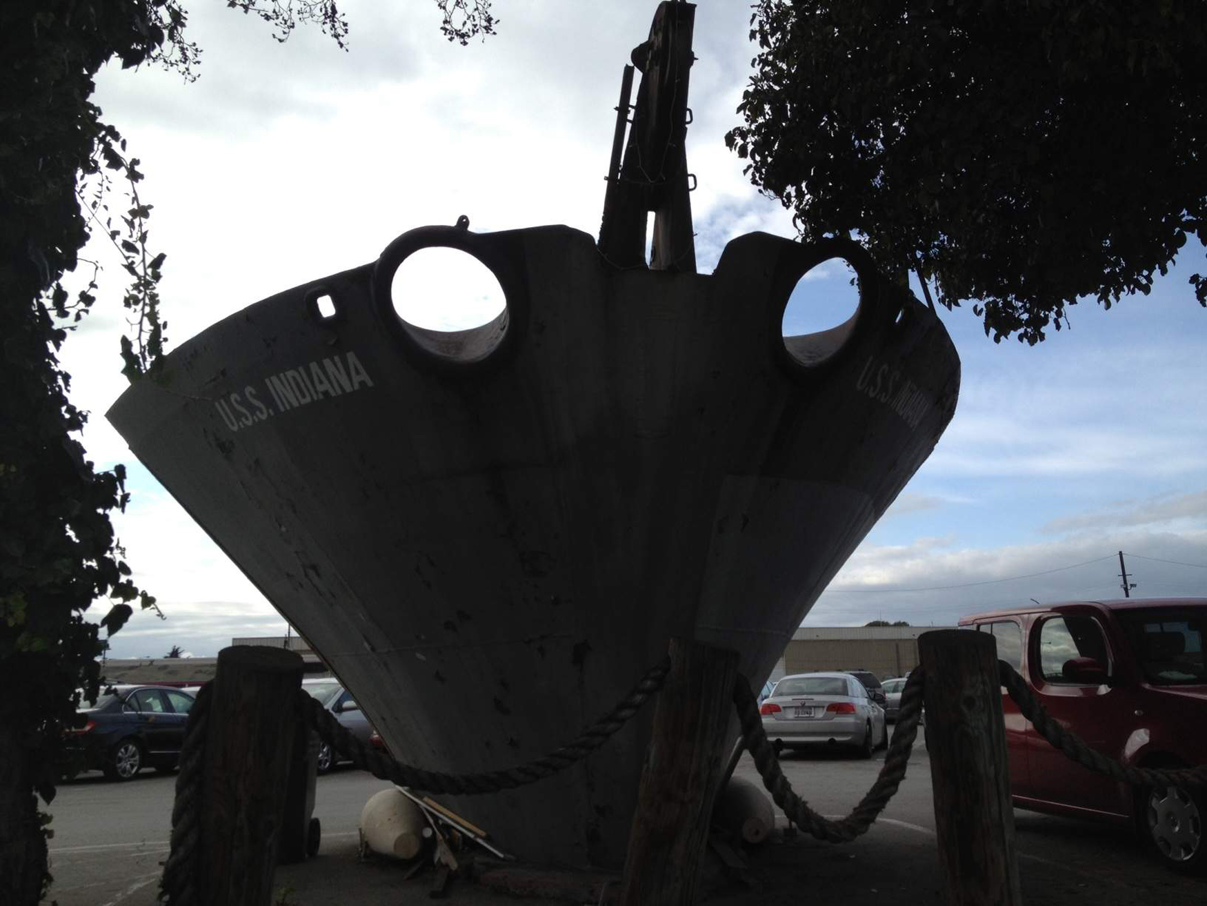787k | Bow of the Indiana (BB-58) in a parking lot in Berkeley California, December 2011. | Photo courtesy of Jeremy Dennis. | |