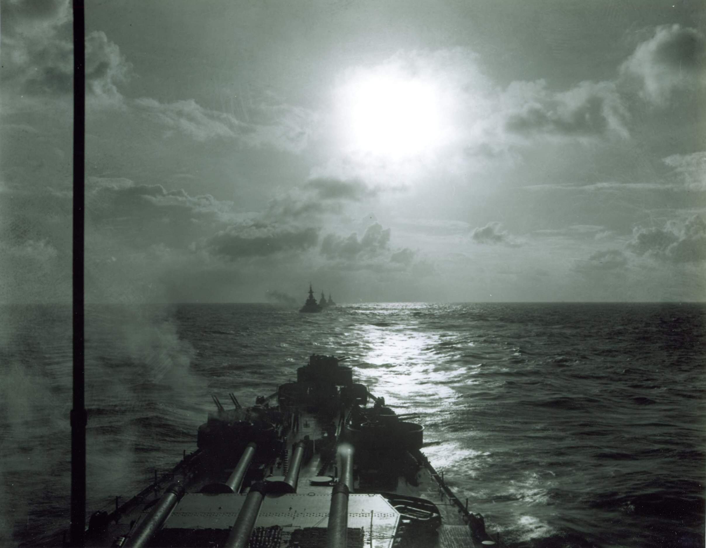 419k | The battleships Indiana (BB-58) and Massachusetts (BB-59) operating off Honshu. The Massachusetts is firing. The South Dakota (BB-57) can be seen behind her. | USN photo courtesy of Pieter Bakels. | |