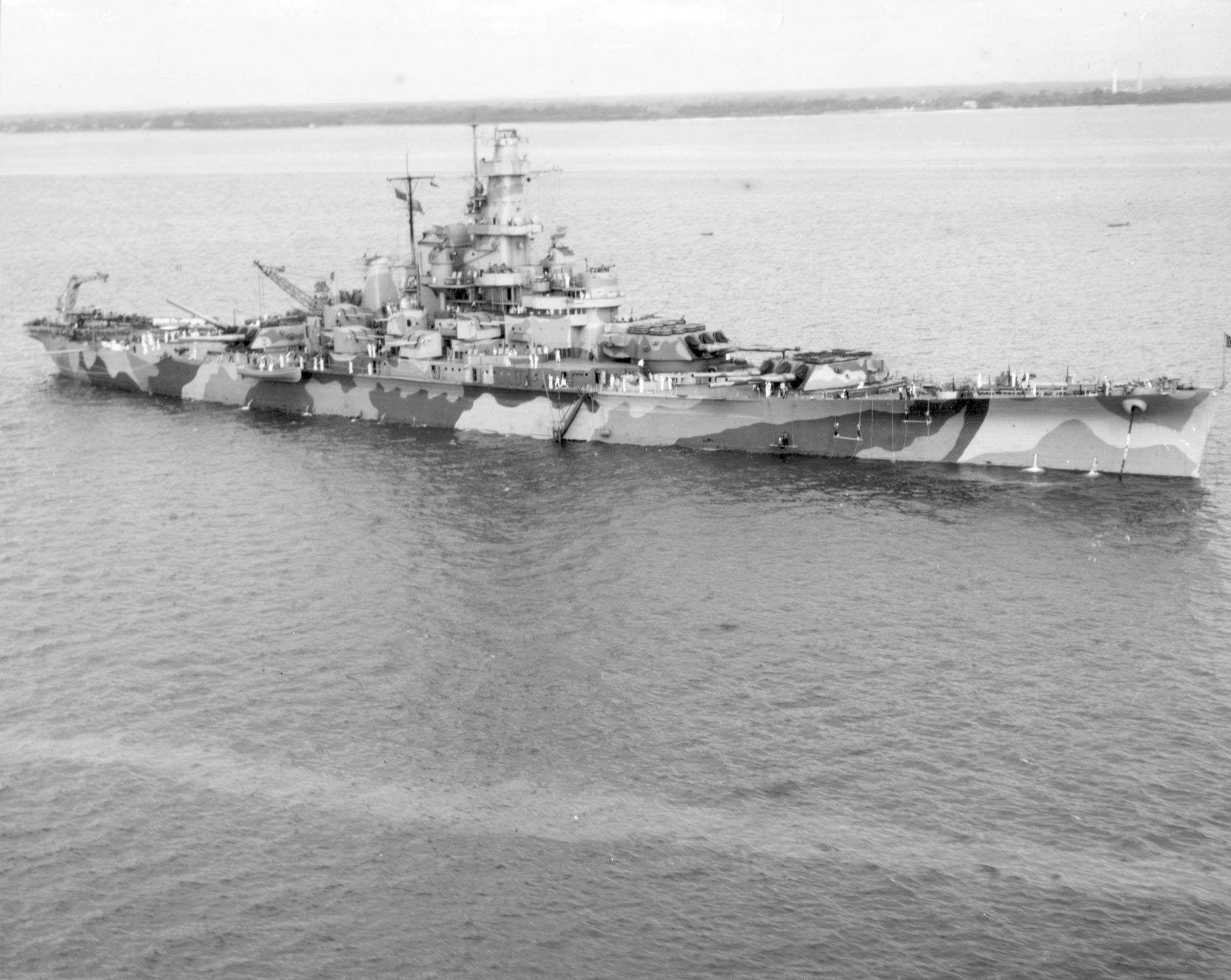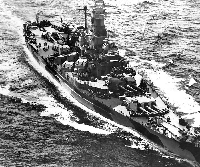700k | 1944 picture of the Indiana (BB-58) after Pearl Harbor refit following collision with Washington (BB-56) in February, 1944. | USN photo courtesy of David Buell + Pieter Bakels. | |