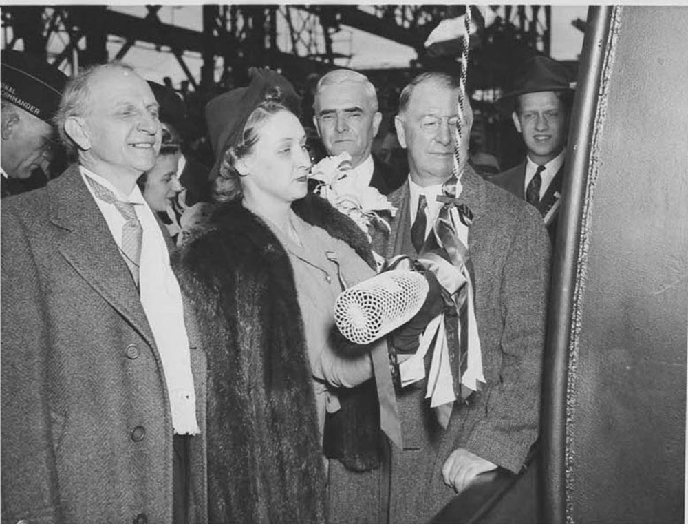 233k | The christening by Margaret Schricher Robbins, daughter of Indiana governor Henry F. Schricher. In the photo from left to right are: Indiana governor Henry F. Schricker, Mrs. Margaret Robbins, sponsor and daughter of the governor, Governor James H. Price of Virginia, and Secretary of the Navy Frank Knox. | Photo courtesy of Dale Hargrave. | |