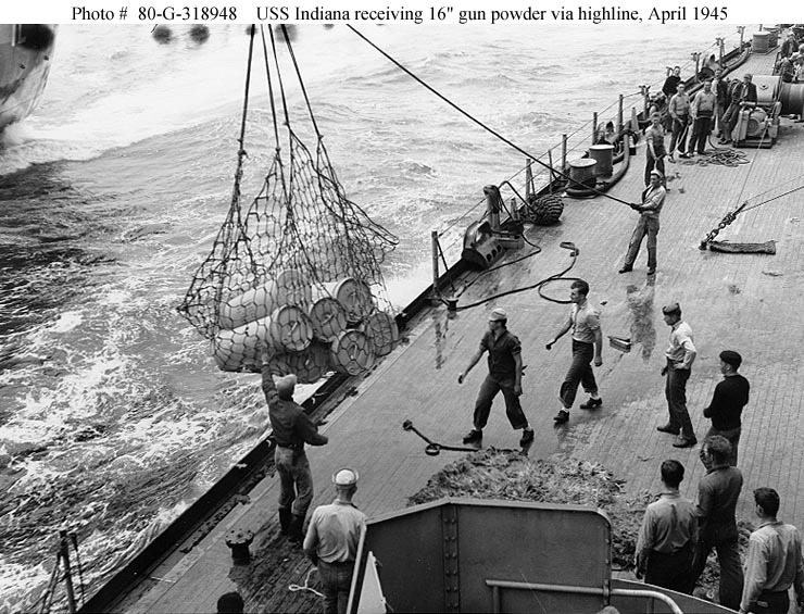 134k | Indiana (BB-58) receives powder for her 16-inch guns, via highline from Wrangell (AE-12), during the Okinawa operation, 8 April 1945. | Official USN photo # NH 80-G-318948, from the collections of the Naval Historical Center. | |