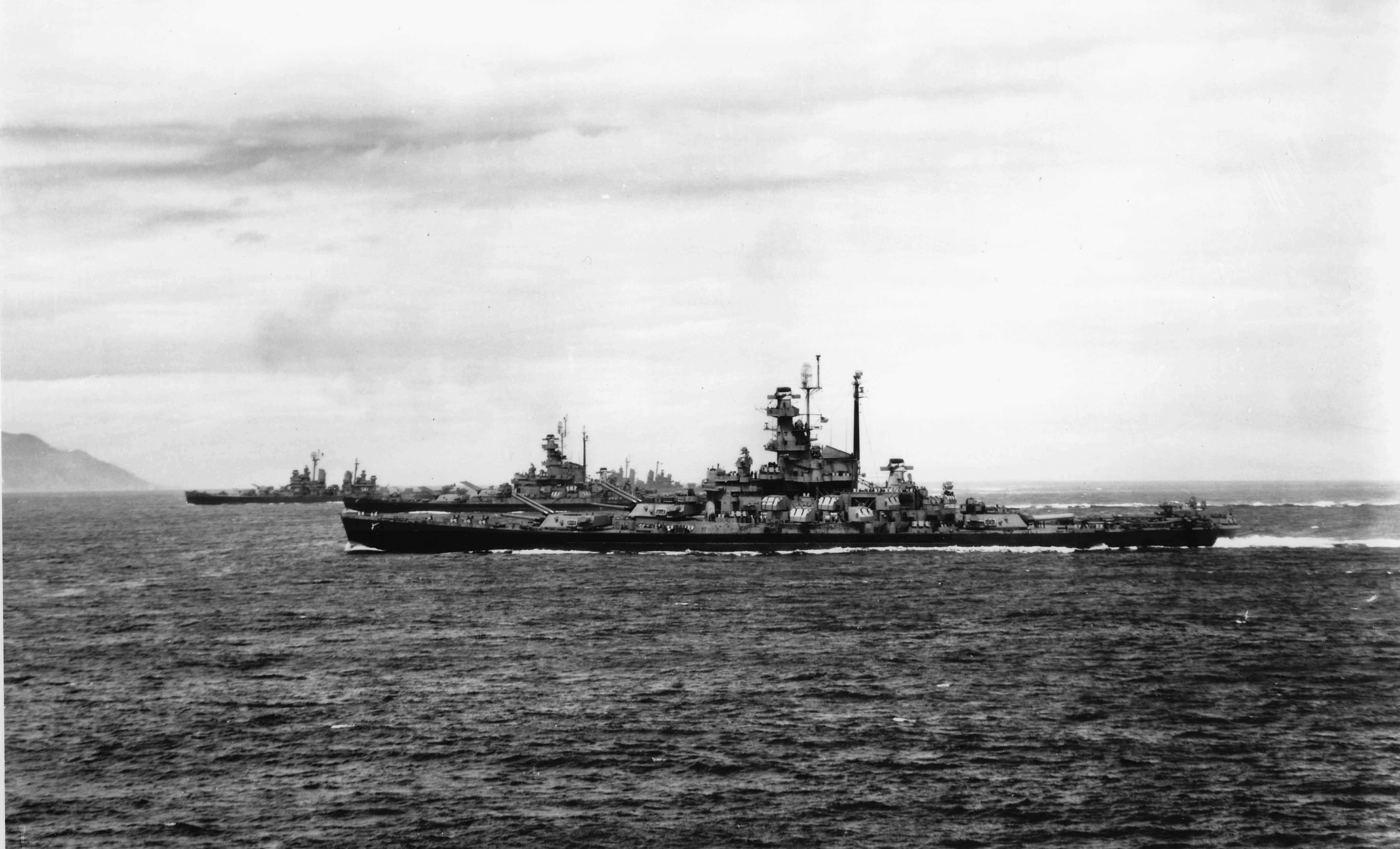 3.22k | THIRD FLEET WARSHIPS FORM BATTLE LINE OFF JAPAN. MOVING IN COLUMN, SOME OF THE THIRD FLEET WARSHIPS MANEUVER NEAR KAMAISHI, ON JAPAN'S HOME ISLAND OF HONSHU ON JULY 14. A FEW MINUTES LATER THEY OPENEDFIRE ON THE IMPERIAL IRON WORKS AT KAMAISHI. NAVY DID NOT NAME WARSHIPS BUT SAID MASSACHUSETTS (BB-59), SOUTH DAKOTA (BB-57), INDIANA (BB-58), QUINCY (CA-71) AND CHICAGO (CA-136) PARTICIPATED IN THE SHELLING. Bombardment of Kamaishi, Japan, 14 July 1945. Battleships and heavy cruisers steam in column off Kamaishi, at the time they bombarded the iron works there, as seen from South Dakota (BB-57). Indiana (BB-58) is the nearest ship, followed by Massachusetts (BB-59). Cruisers Chicago (CA-136) and Quincy (CA-71) bring up the rear. |