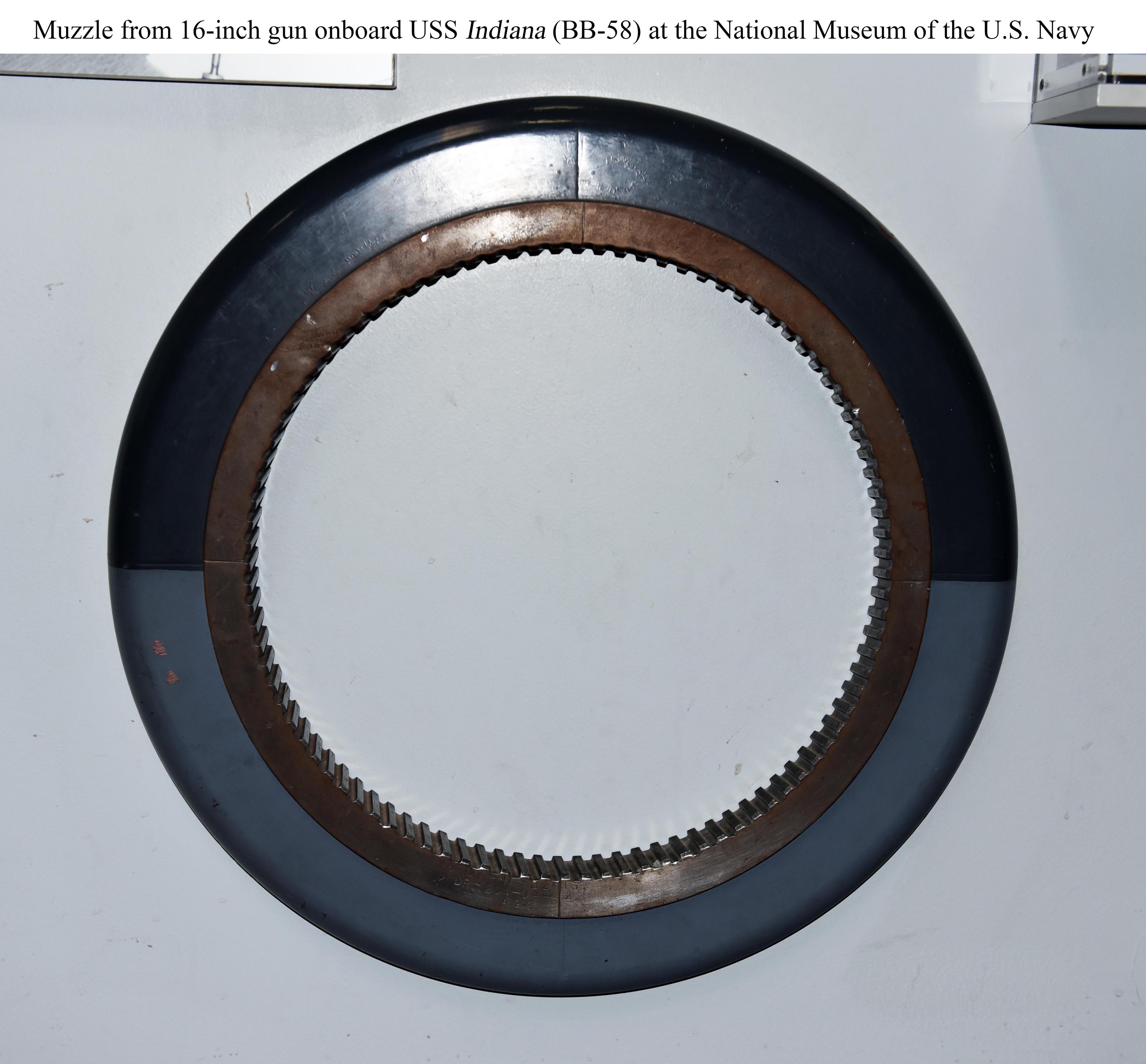 719k | Indiana's (BB-58) gun muzzle on Display at the Pacific Theatre Section of the National Museum of US Navy. | Photo courtesy of Yu Chu. | |
