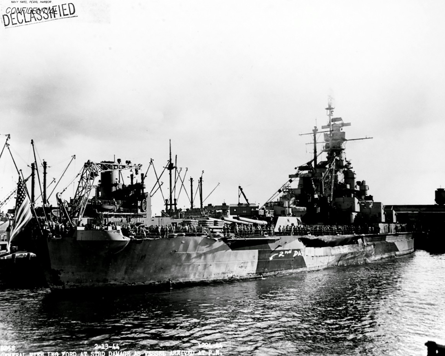 646k | Indiana (BB-58) at Pearl Harbor on 13 February 1944, showing damage to her starboard side received in her 1 February 1944 collision with Washington (BB-56). | Official USN photo # NH 92880, from the collections of the Naval Historical Center. | |