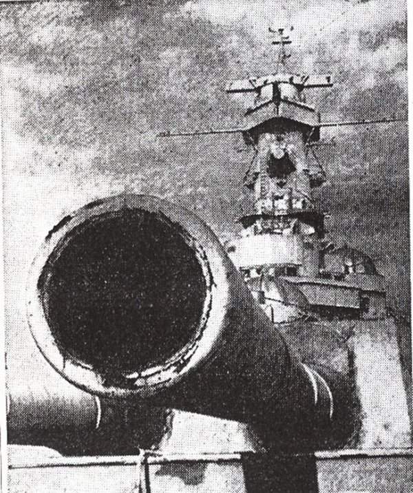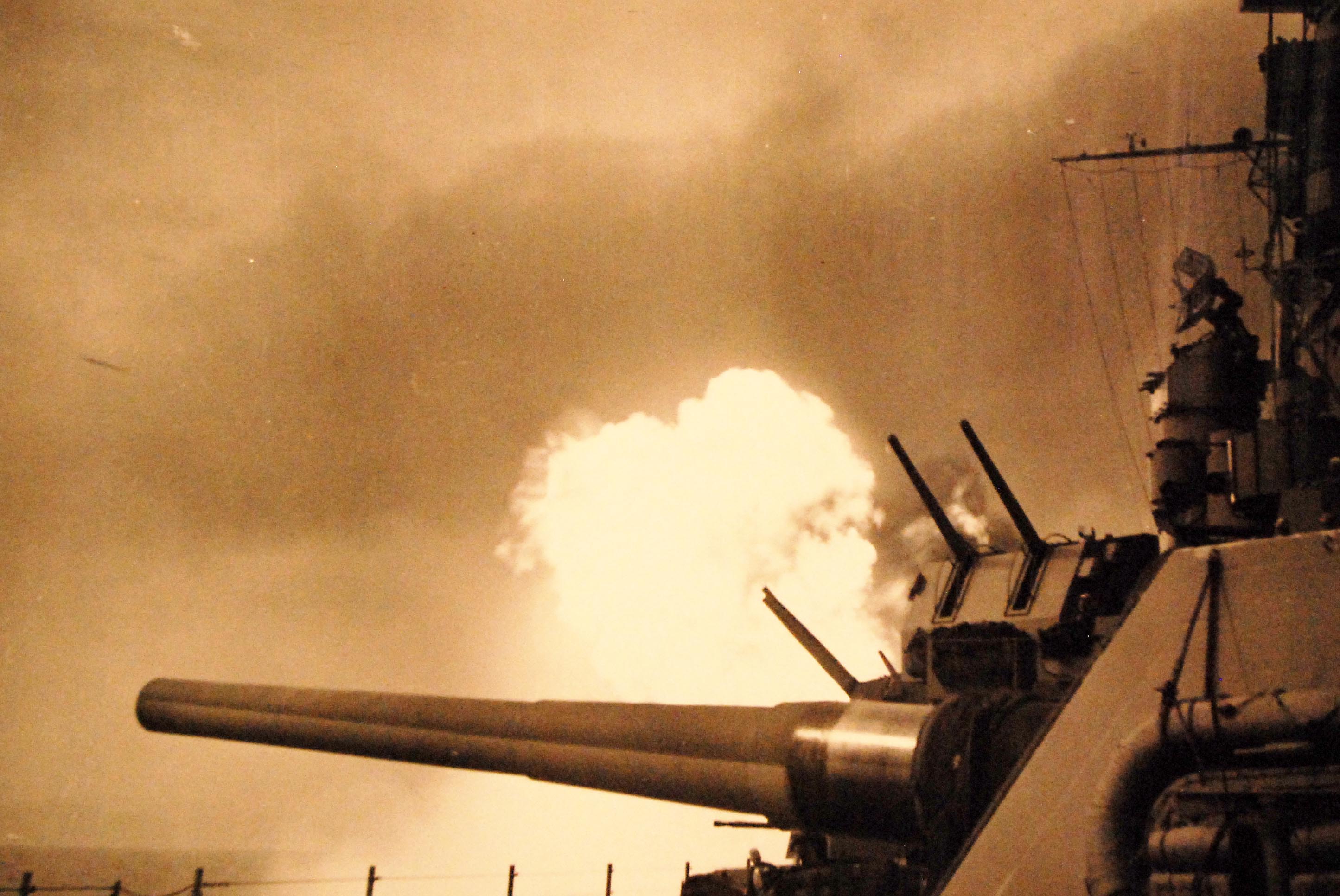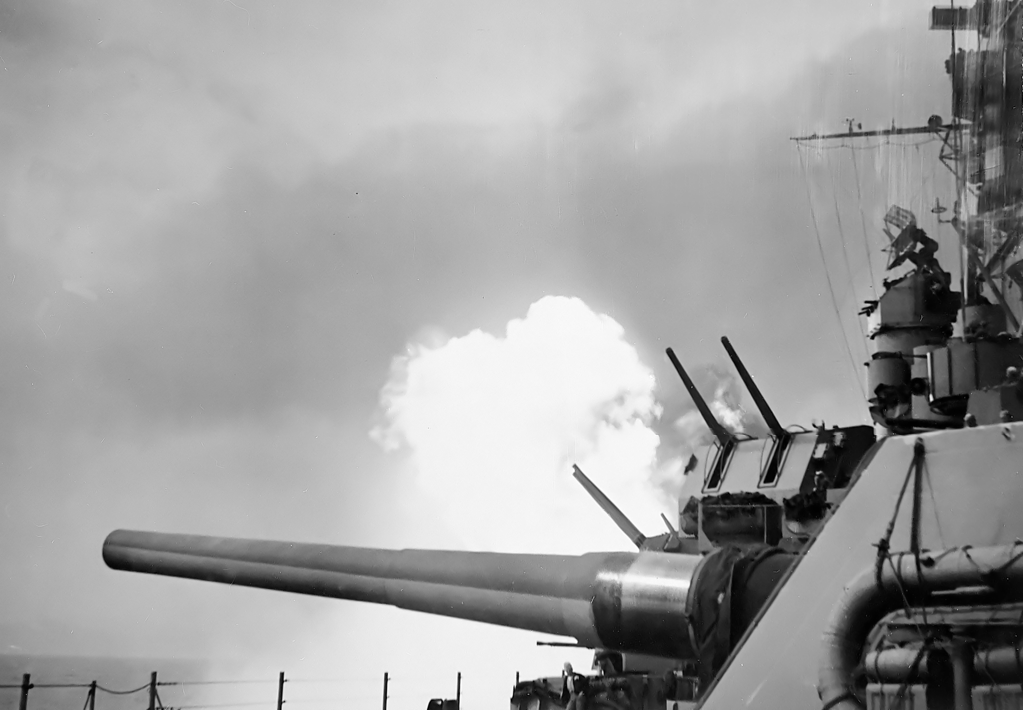 502k | Indiana (BB-58) target was city and steel works of Kamaishi, Honshu, Japan. 16" guns fire forward. Projectiles can be seen in the left of picture. This was the last salvo of the last shot in the entire bombardment, perhaps the last shot of the war. Photographed by PhoM2/c Frank P. Fish onboard Indiana, 9 August 1945. | USN photo # 80-G-339340, courtesy of the National Museum of the U.S. Navy, via flickr.com. | |