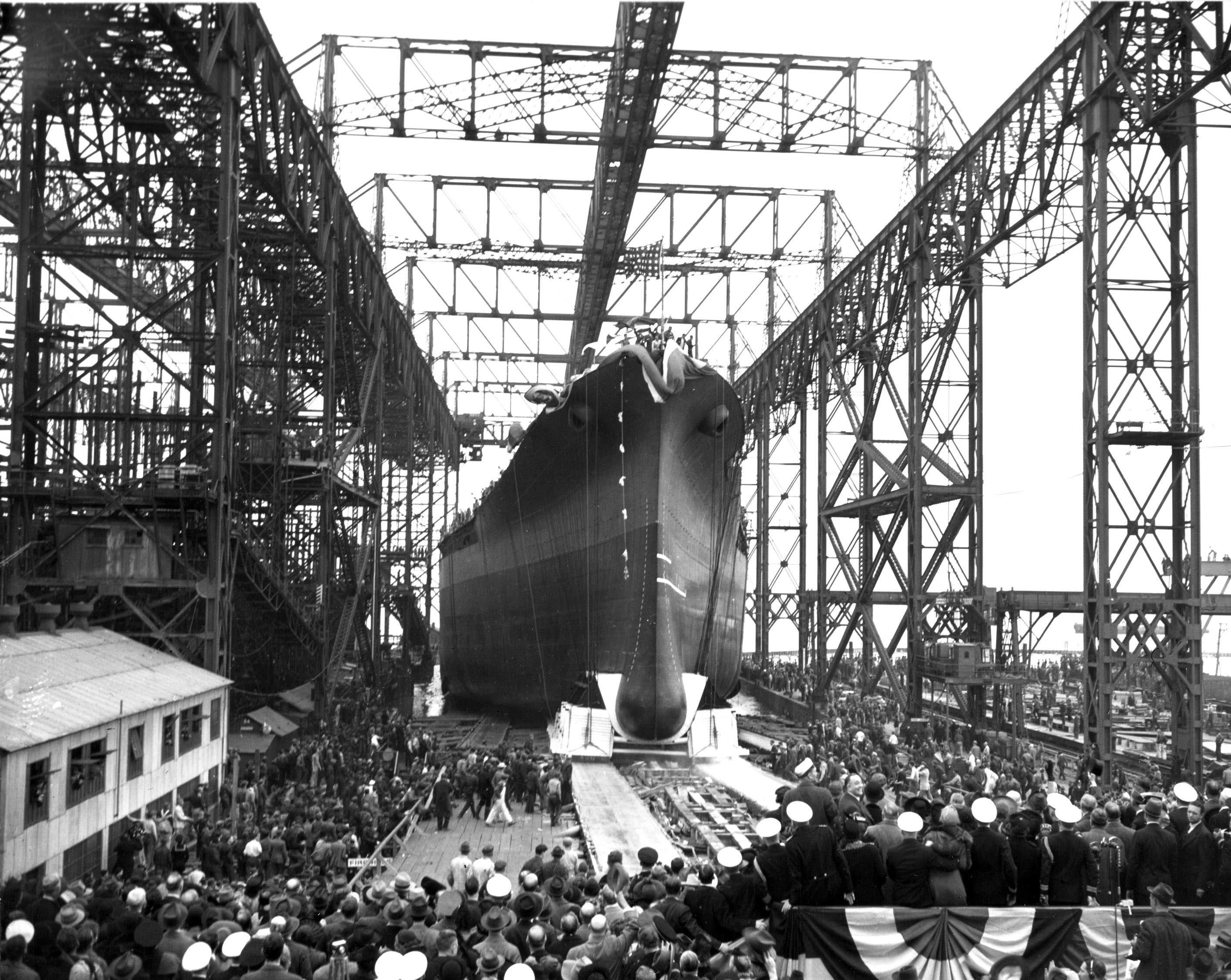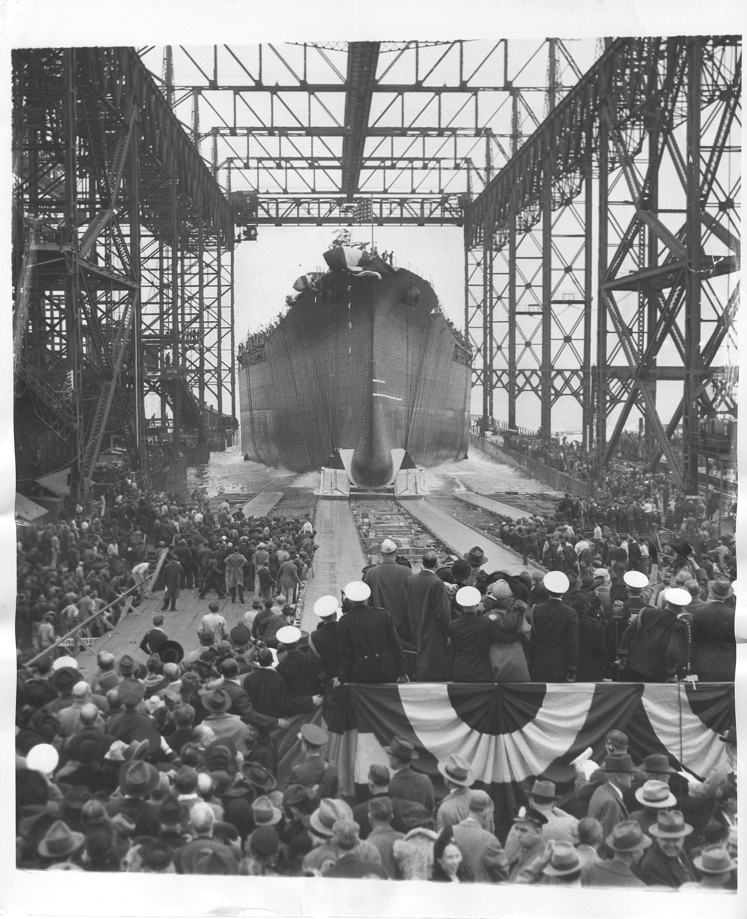 906k | The U.S. navy's new battleship Indiana (BB-58); seen here ready for the trigger pull which sent her down the ways into the James river at Newport News; Va.; yesterday; enjoys two distinctions. She was completed six months ahead of schedule; and at the time of her launching she was the heaviest of any ship ever to slide down the ways of a U.S. shipyard. She weighs 35,000 tons. | Photo by Toronto Star Archives/Toronto Star via Getty Images courtesy of gettyimages.com. | |