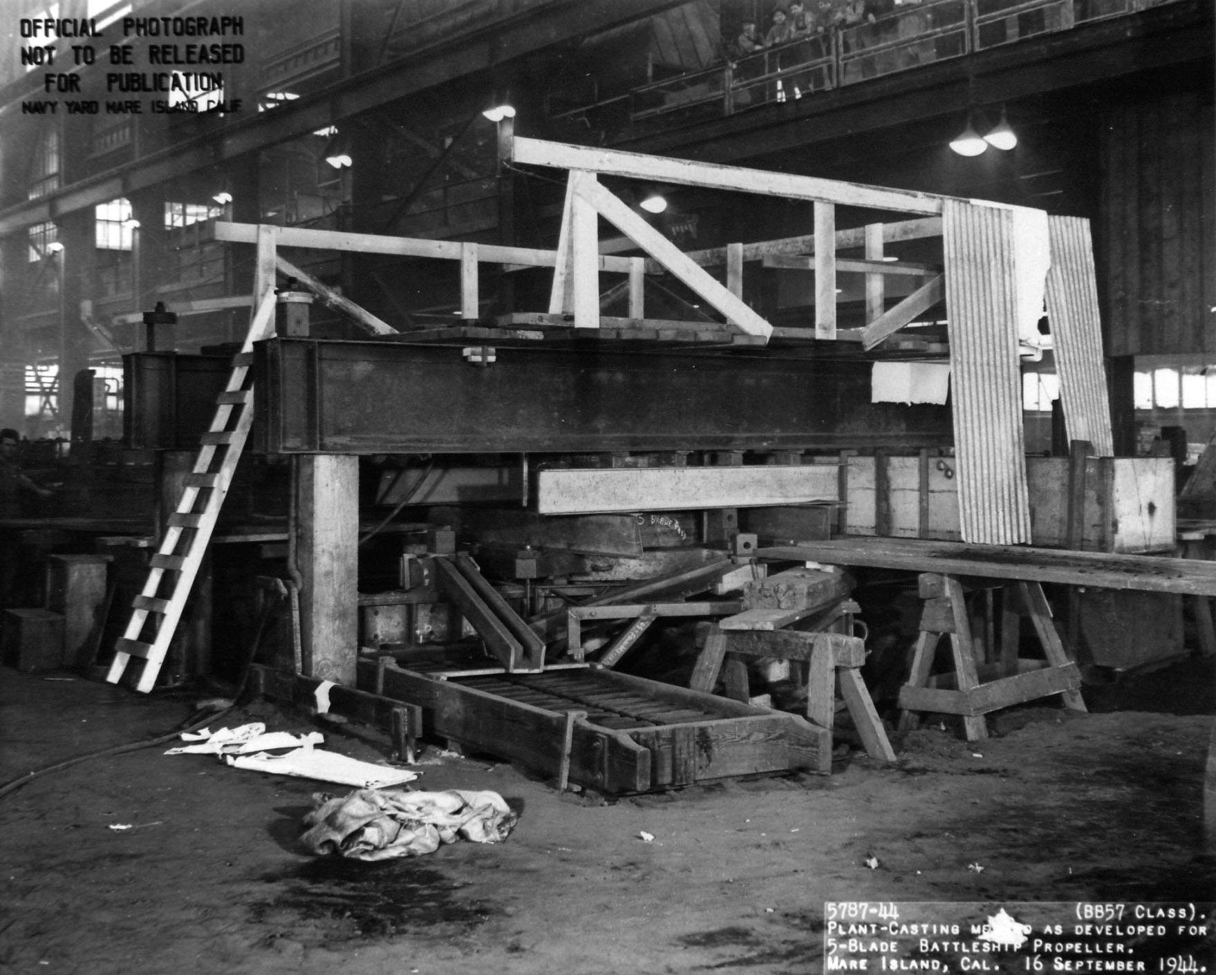 254k | Indiana (BB-58) departed for Bremerton, Wash., from the Pacific battle zone, arriving 23 October 1944. The following three photos show BB-57 Class propellers being cast at Mare Island on 16 September 1944, probably for her use during her subsequent refit. Note the writing "5 blade prop" under the stand. | USN photo # 5787-44, courtesy of Darryl L. Baker. Partial text courtesy of DANFS. | |