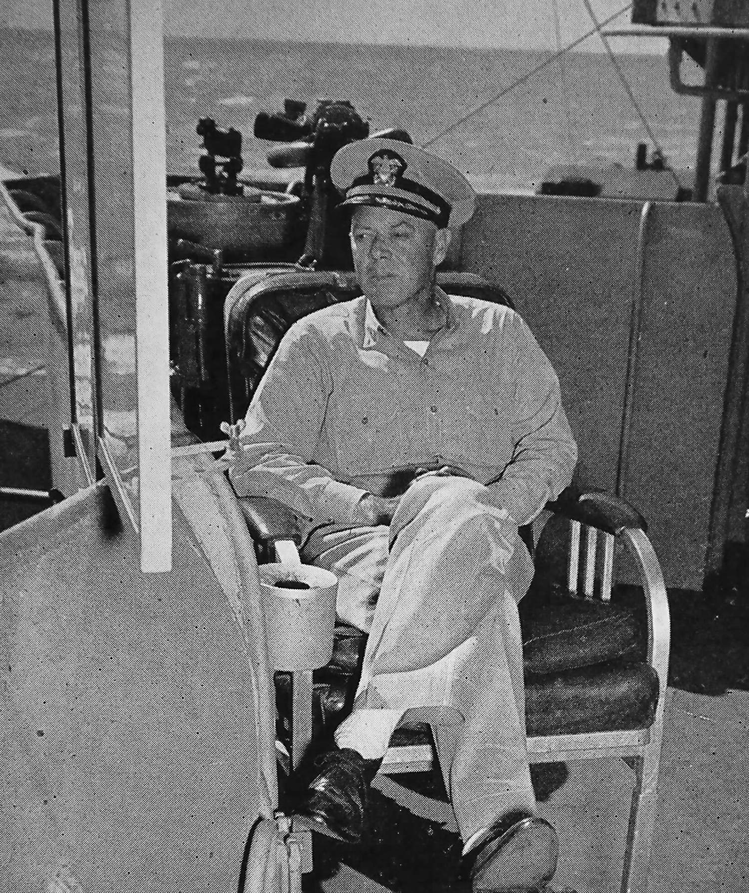 349k | Captain A.S. Merrill, USN, Commanding Officer of Indiana (BB-58) poses on the bridge of his warship following ceremonies held at Newport News, Virginia, 30 April 1942. He stated, "I'll probably spend the rest of the war up here" to the photographers. | USN photo # 0-G-6679 from the National Museum of the U.S. Navy via flickr.com. | |