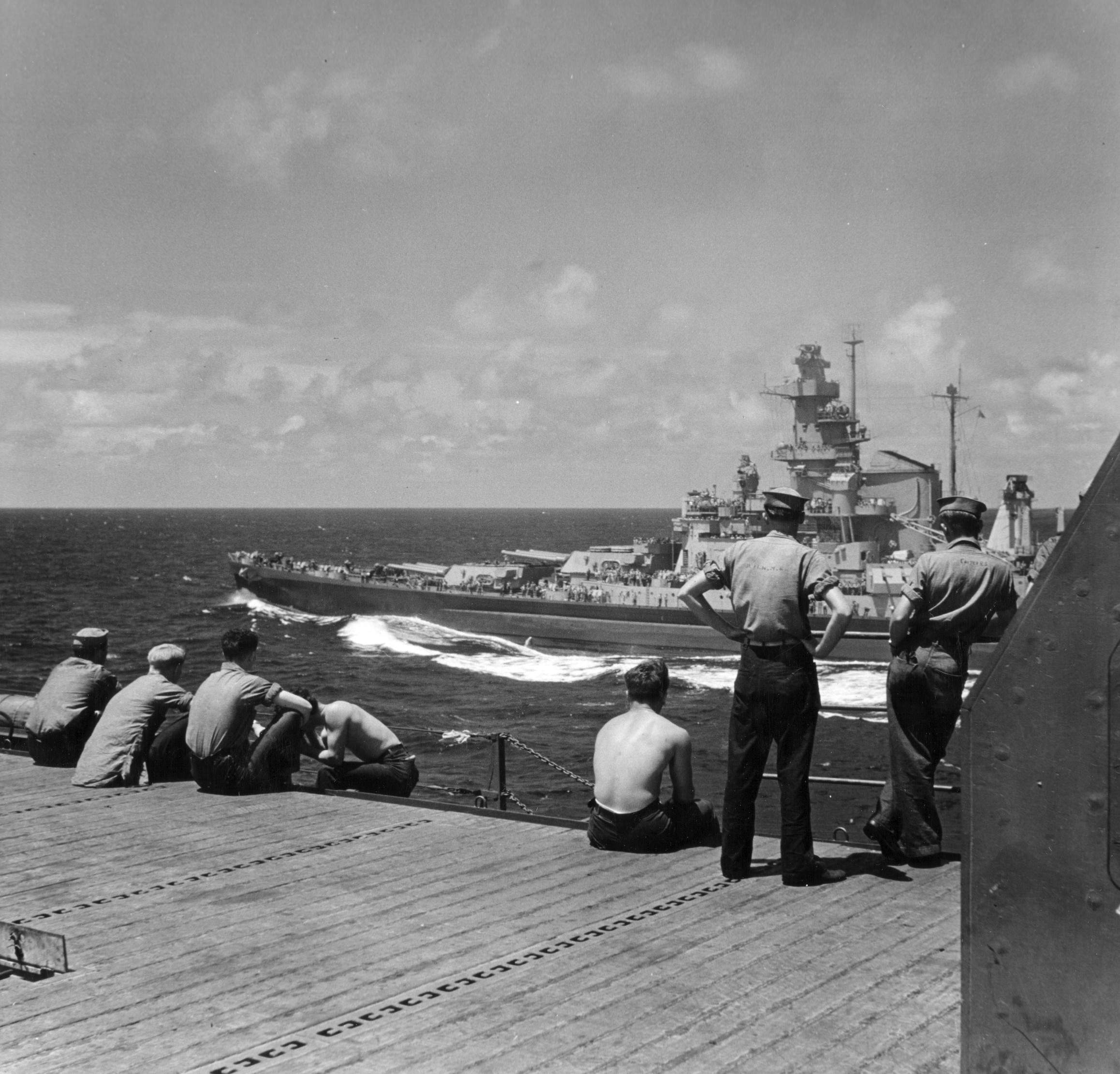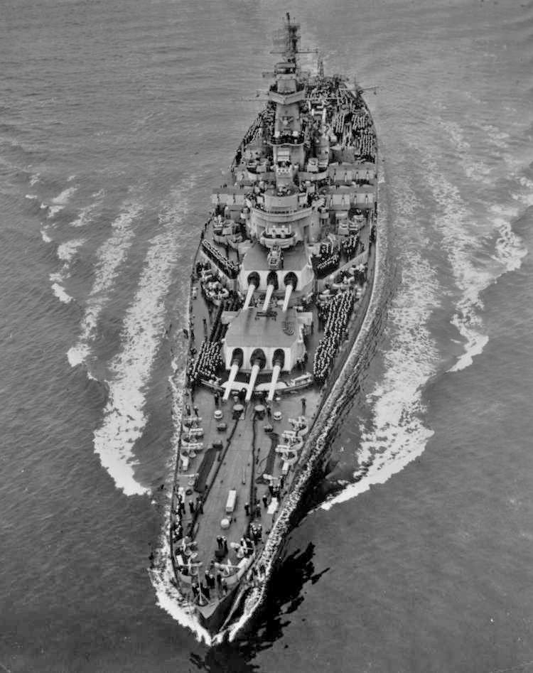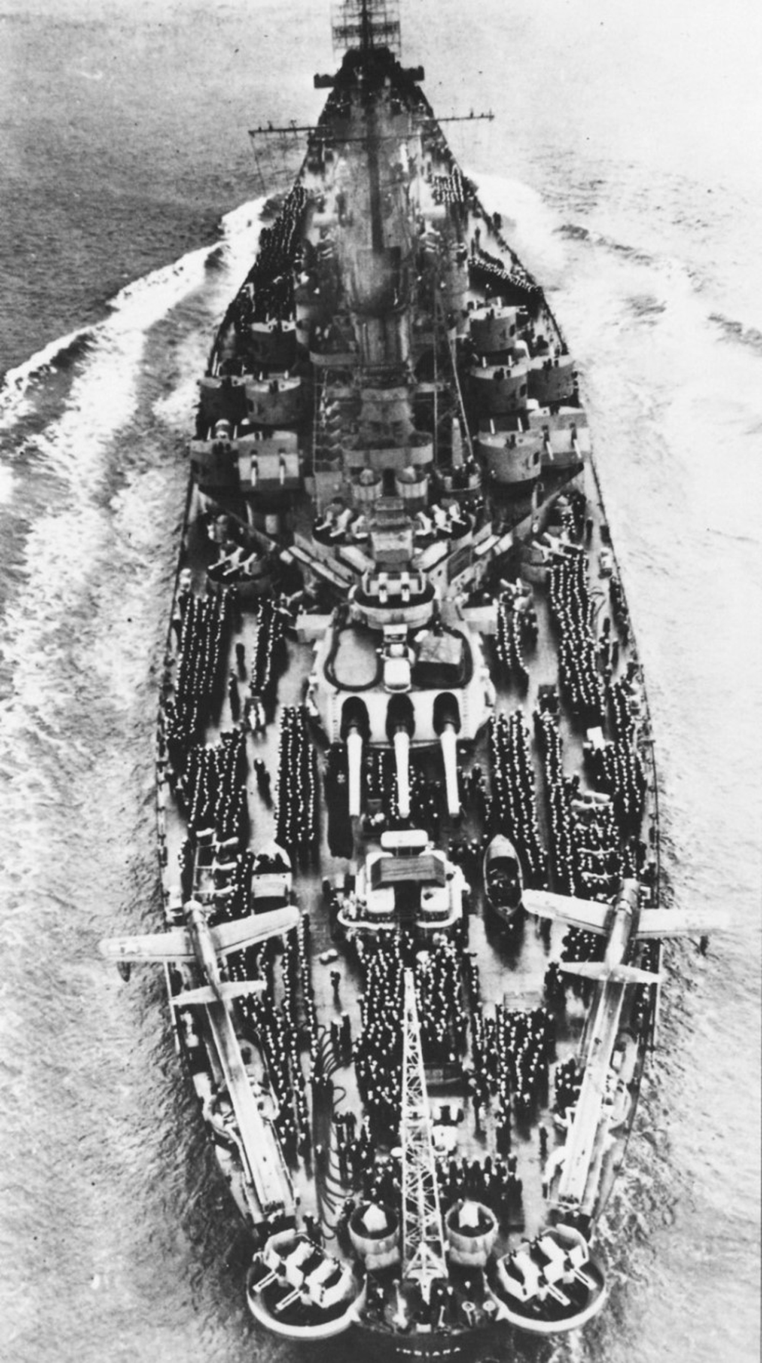 1.20k | Beginning of the end. Indiana (BB-58) and crew heading for home after war's end. |